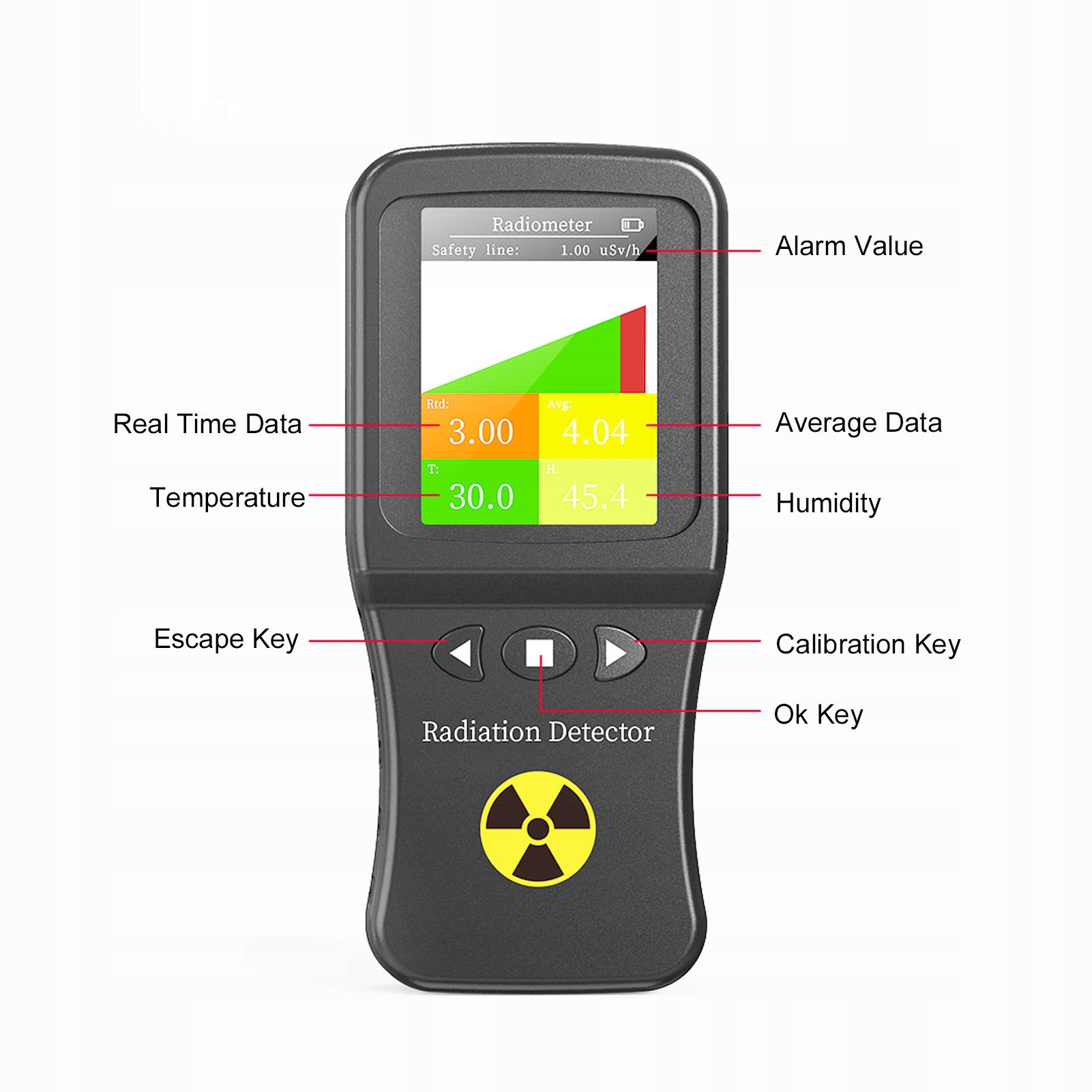 2. Функция сигнализации: позволяет легко вручную настраивать пороговый клапан. Этот детектор ядерного излучения оснащен функцией автоматической сигнализации.