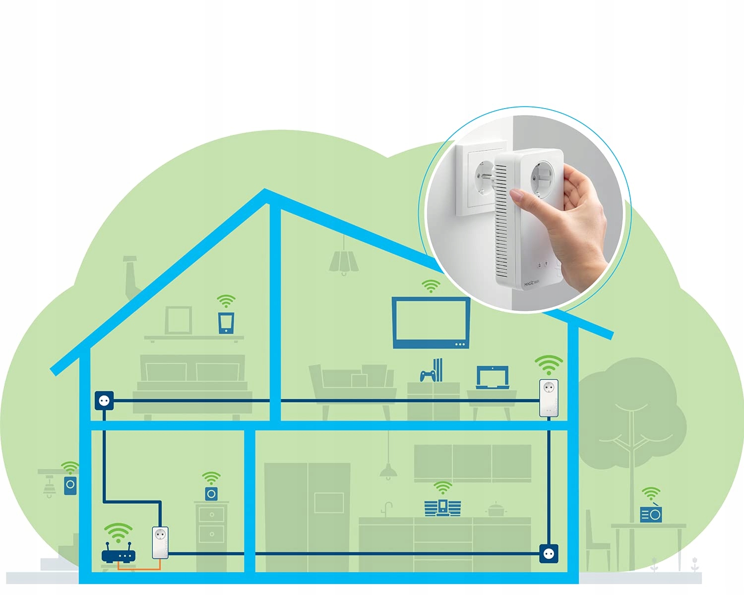- Набор адаптеров для конфигурации Magic Powerline с 2 адаптерами; 1 X LAN + 1 X Wi-Fi: Идеально подходит для Интернета в каждой комнате и на каждом этаже дома до 2 этажей