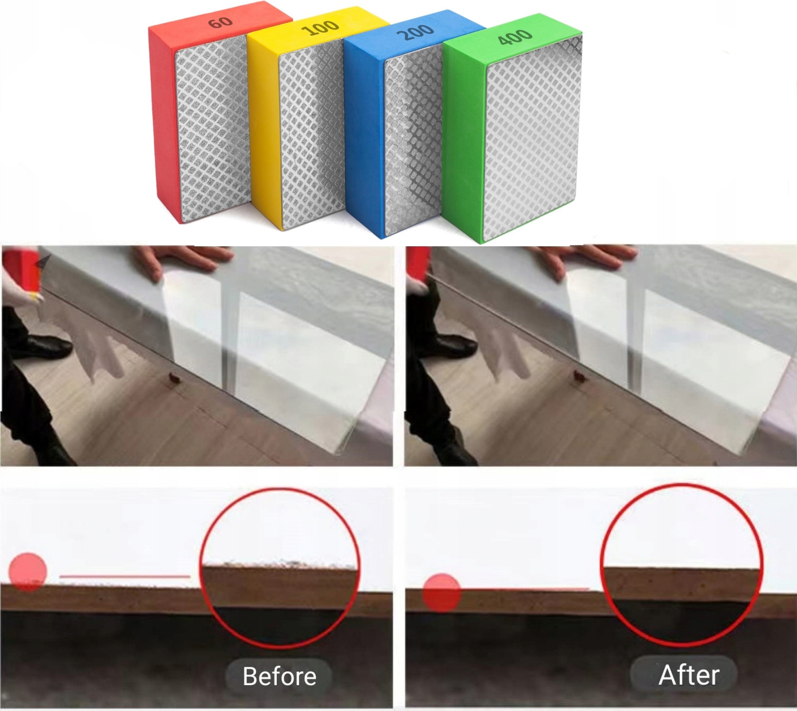 4 штуки вместе: 4 шлифовальных блока 60 Grit , 100 Grit , 200 Grit, 400 Grit для удовлетворения различных требований