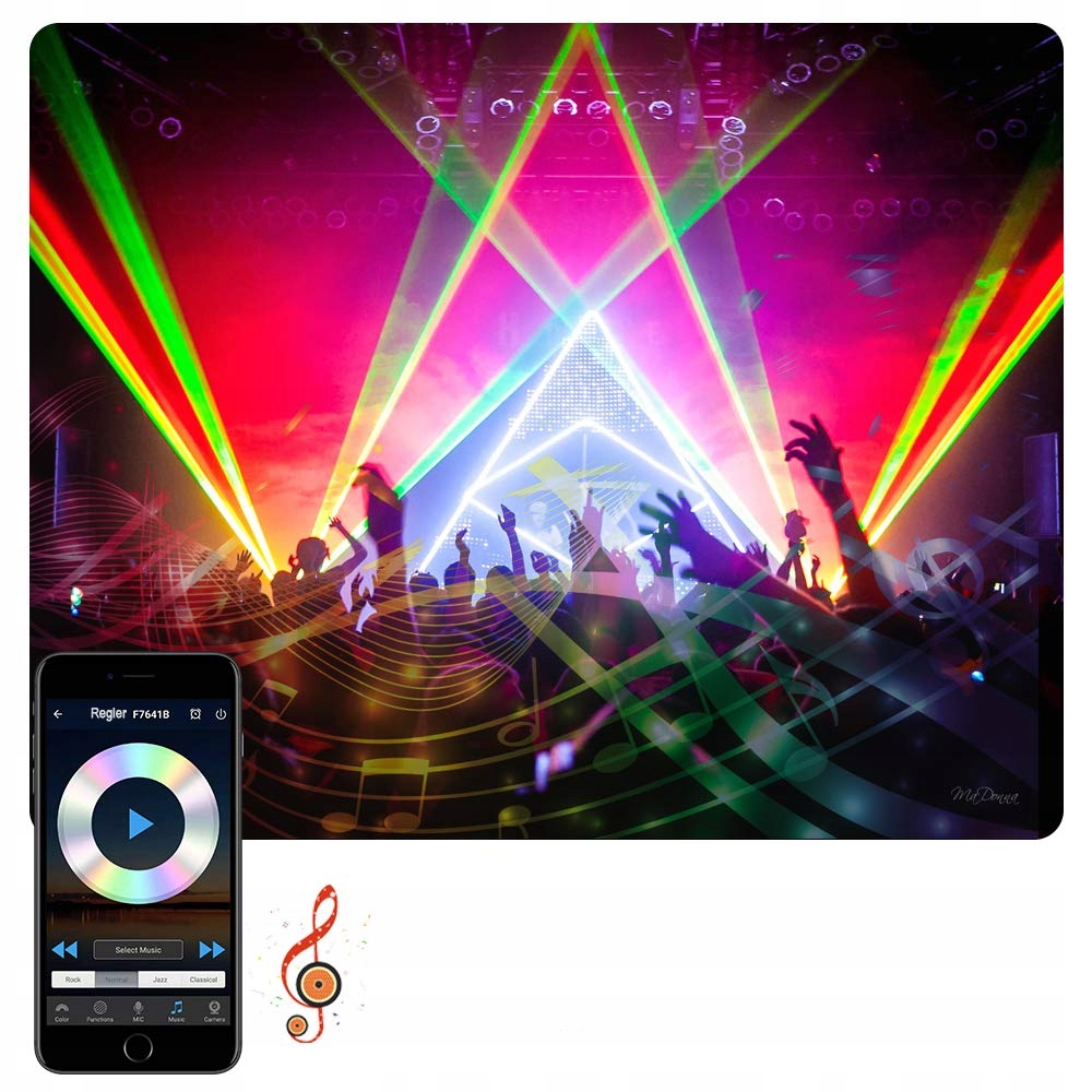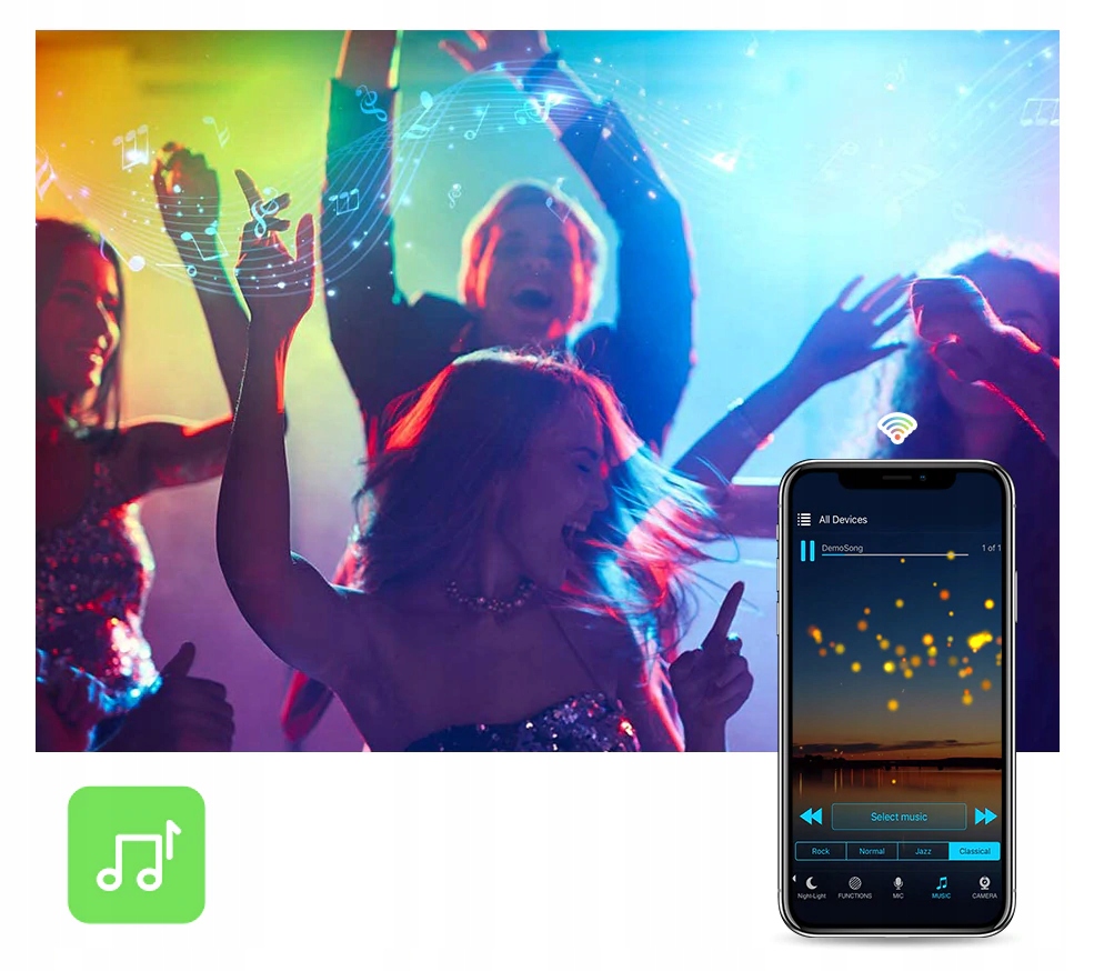 - Музыкальный режим обеспечивает беспроводное управление освещением к ритму музыки прямо из приложения, освещение также может перемещаться по ритму музыки, используя встроенный микрофон в телефоне