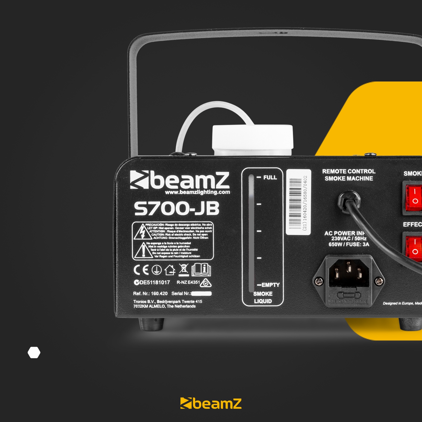 Генератор BeamZ S700-JB оснащен проводным и беспроводным пультом дистанционного управления. Проводной пульт дистанционного управления подключается к машине с помощью кабеля длиной 3 м, что позволяет удаленно активировать генератор, например, из диджейской кабинки. Управлять генератором очень просто: достаточно нажать кнопку, когда загорится зеленый светодиод. Благодаря беспроводному пульту дистанционного управления производство дыма можно легко запустить или остановить удаленно.