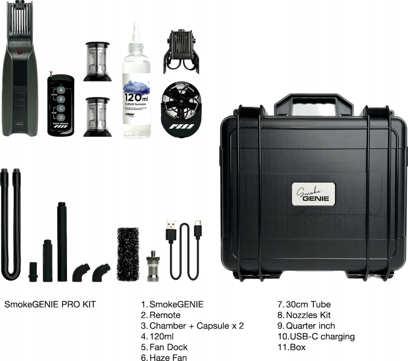 В дополнение к устройству SmokeGENIE в профессиональный комплект входят беспроводной пульт дистанционного управления, две сменные дымовые камеры, адаптер для вентилятора, четыре прецизионные насадки для формирования дыма, насадка для жидкого дыма и 12-дюймовая силиконовая удлинительная трубка. Cloud Formula позволяет вам сразу приступить к работе. В комплект поставки входят три литий-ионные батареи 18650 и батарея на 23 А для питания SmokeGENIE и пульта дистанционного управления. SmokeGENIE и аксессуары находятся в безопасности во время путешествия благодаря прилагаемому жесткому защитному футляру.