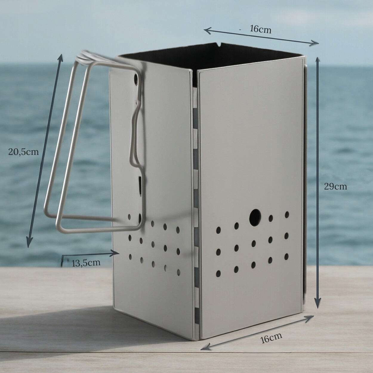 Этот объект благодаря его конструкции обеспечивает оптимальную циркуляцию воздуха, что гарантирует равномерное и более быстрое освещение угля. Камин изготовлен из высококачественной нержавеющей стали, что делает ее прочной и прочной. Несмотря на компактный размер, стальной каминный гриль может использоваться не только для легкого угля, но также может выступать в качестве маленького садового гриля или пожарной миски.