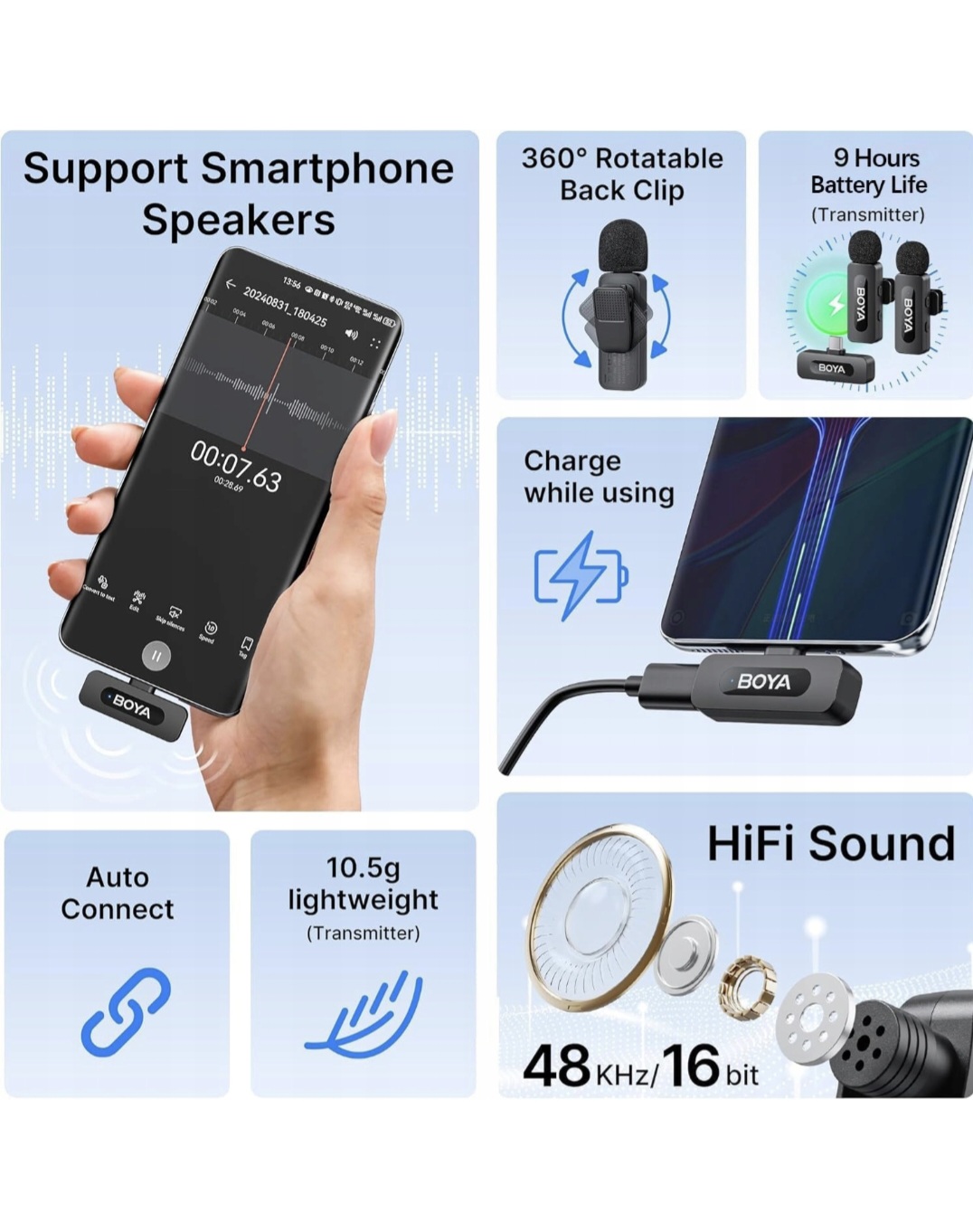 Микрофон Boya by-v20-отличное решение для создателей контента, которым нужно надежное оборудование для записи звука. Благодаря современной беспроводной технологии 2,4 ГГц, этот микрофон предлагает стабильный ассортимент до 100 метров, что делает его идеальным для интервью, на открытом воздухе или живой трансмиссии. Разве вы не мечтаете о свободе движения во время записи?