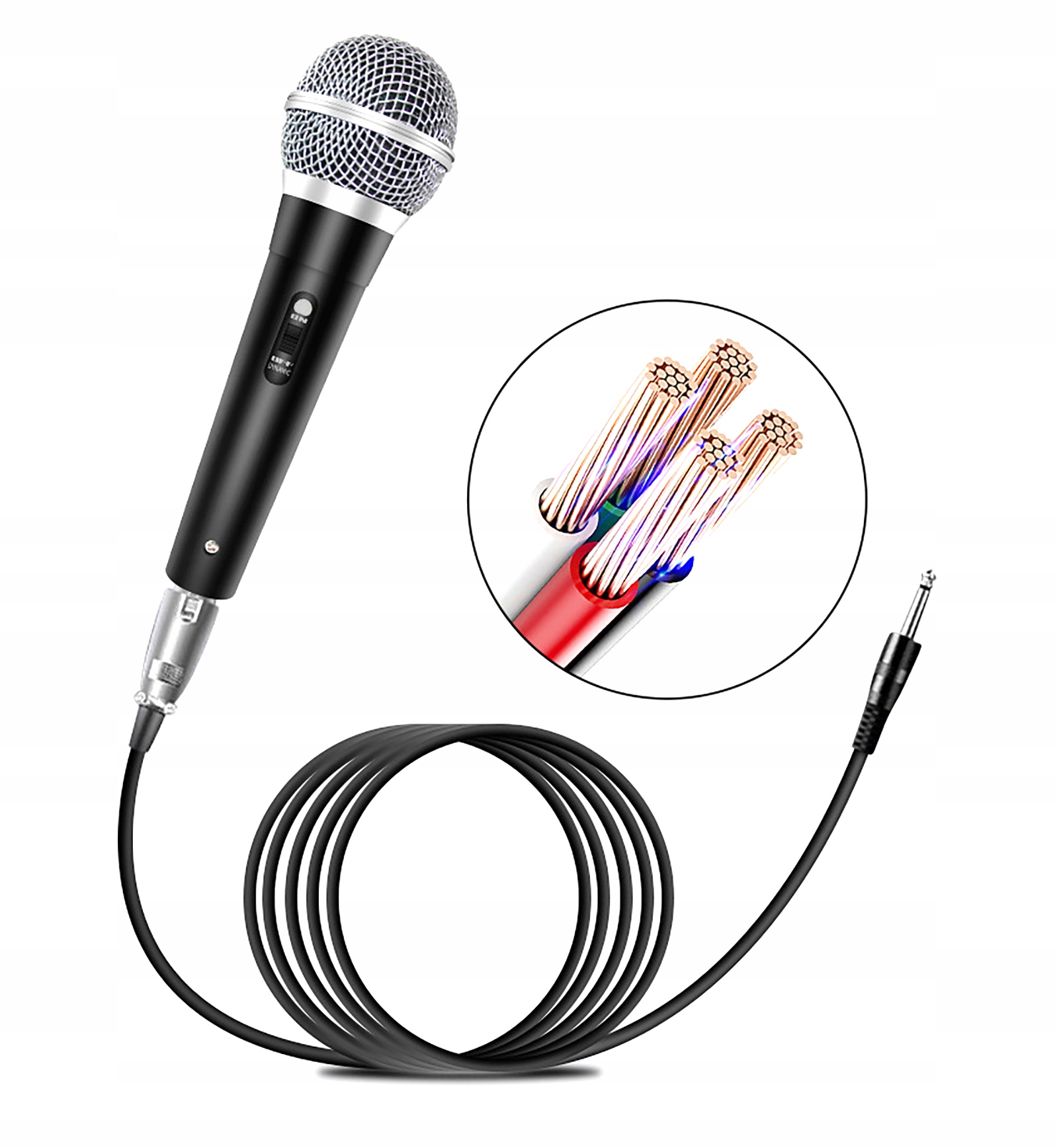 Входящий в комплект кабель длиной 5 м с разъемом 6,3 мм позволяет легко подключать микрофон к динамикам, усилителям или консолям.