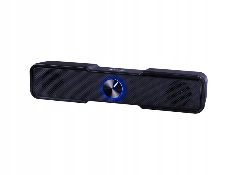 Саундбар для компьютера со светодиодной подсветкой для регулировки громкости. Резиновые ножки предотвращают скольжение по поверхности стола. Громкость звука регулируется встроенным переключателем.