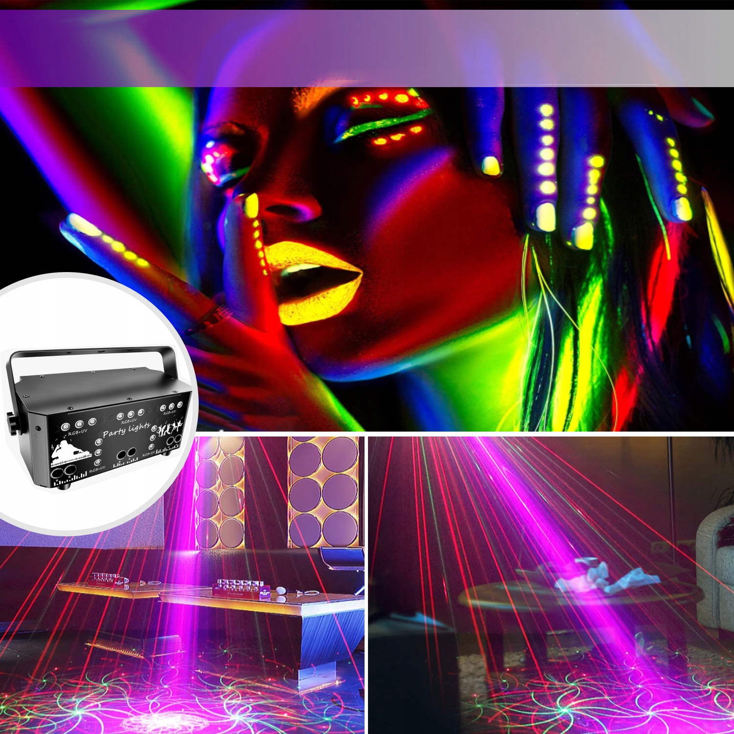 【DJ Disco Light Party Light】Светодиодный светильник для вечеринок с 21 глазком Disco Light Party Light использует конструкцию с двумя линзами для покрытия большой площади. 15 линз для RGB и светодиодных светильников и 6 линз для узорчатого освещения создают комбинацию из 3 различных источников света (стробоскоп, RGB и свет для вечеринок). Широкая область освещения может осветить весь зал для вечеринки и создать впечатляющее освещение для вашей вечеринки.