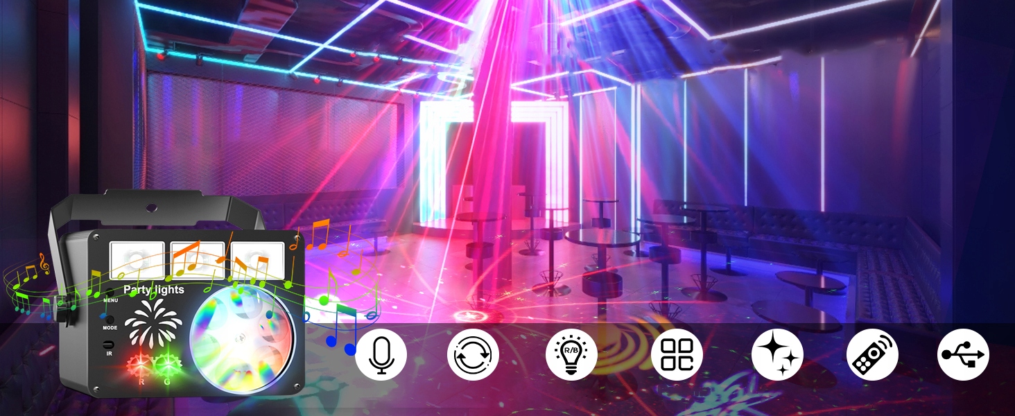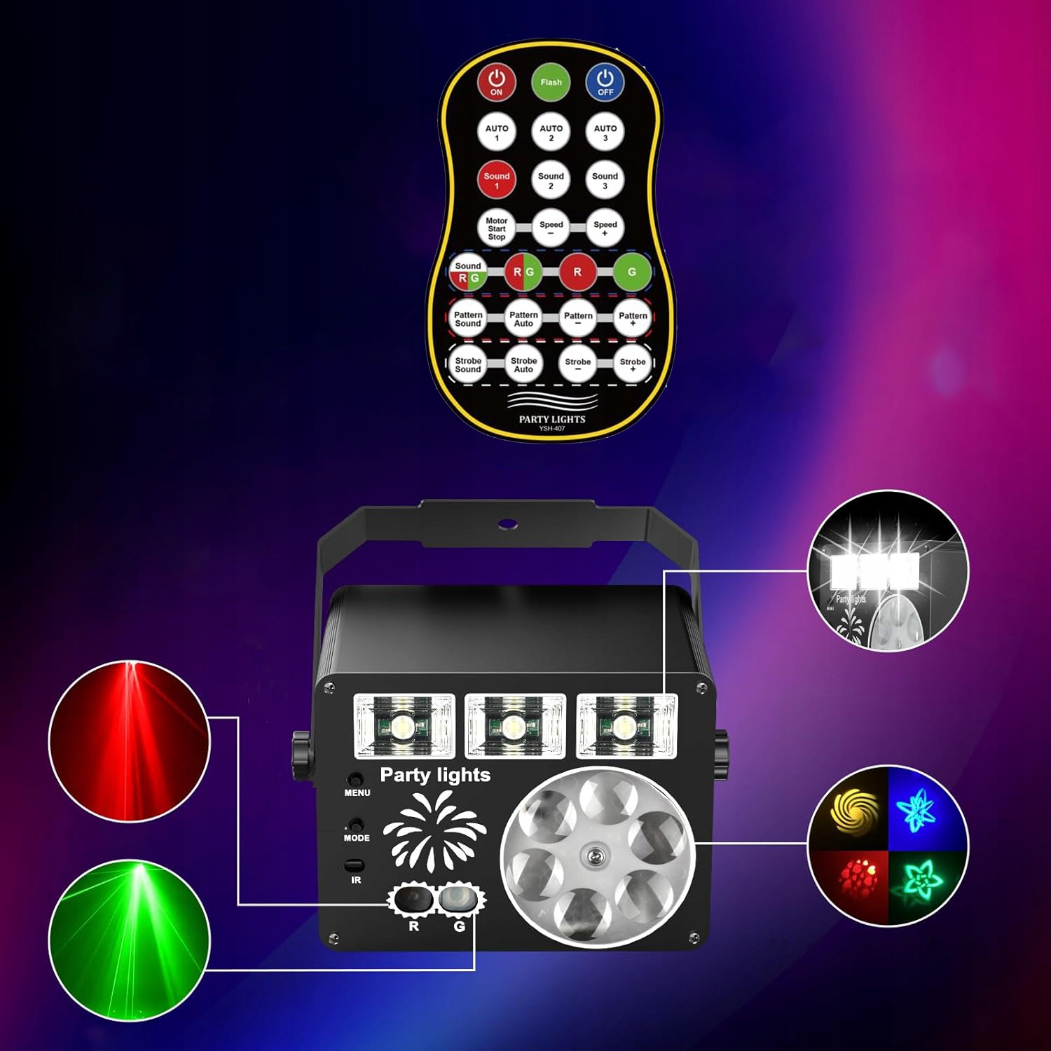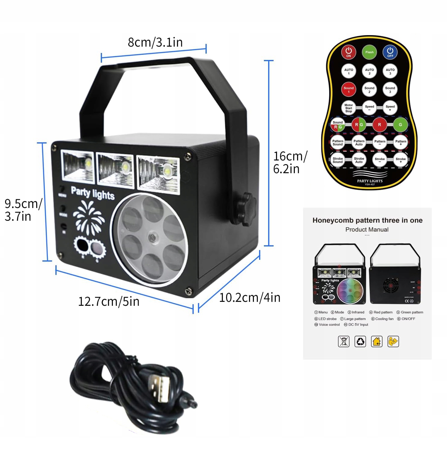 - Этот модернизированный светильник для дискотеки 3 в 1 включает в себя вращающийся сотовый свет, зеленый и зеленый светодиоды, а также белый светодиод со стробоскопической/УФ-волной.
