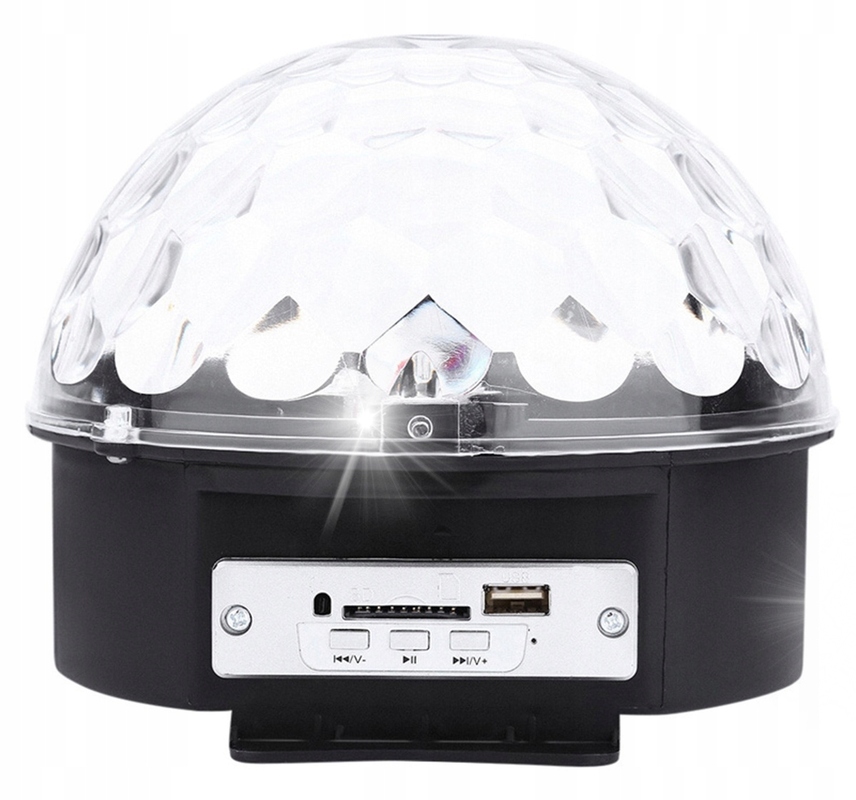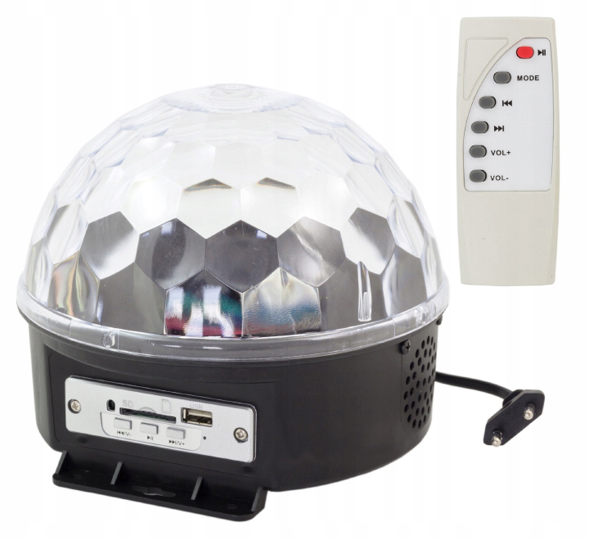 Дискошар со встроенным MP3-плеером, SD-кардридером, USB-портом и качественными стереодинамиками. Управление устройством осуществляется с помощью пульта дистанционного управления или с помощью кнопок на передней части корпуса.