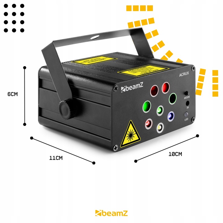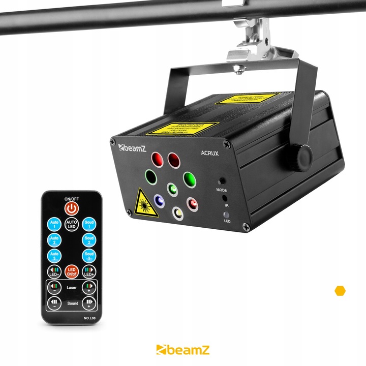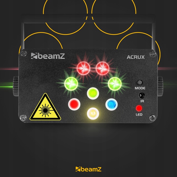Лазер BeamZ Acrux Quatro обеспечивает супер-крутое световое шоу в небольших помещениях. С помощью этого лазера вы можете обеспечить свою гостиную, небольшую комнату для вечеринок и т. д. супер-крутым светом и лазерным шоу. У Acrux есть 2 красных и 2 зеленых лазера, которые отображают всевозможные (движущиеся) узоры. Дополнительный эффект дают очень мощные светодиоды, которые добавляют красок помещению. Операцию можно выполнить с помощью прилагаемого пульта дистанционного управления, поэтому управлять Acrux может каждый.