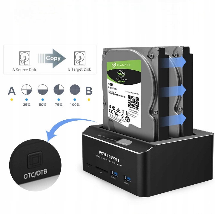 - Нажмите кнопку OTC/OTB на задней панели док-станции, чтобы начать автоматическое копирование данных с диска A на диск B.