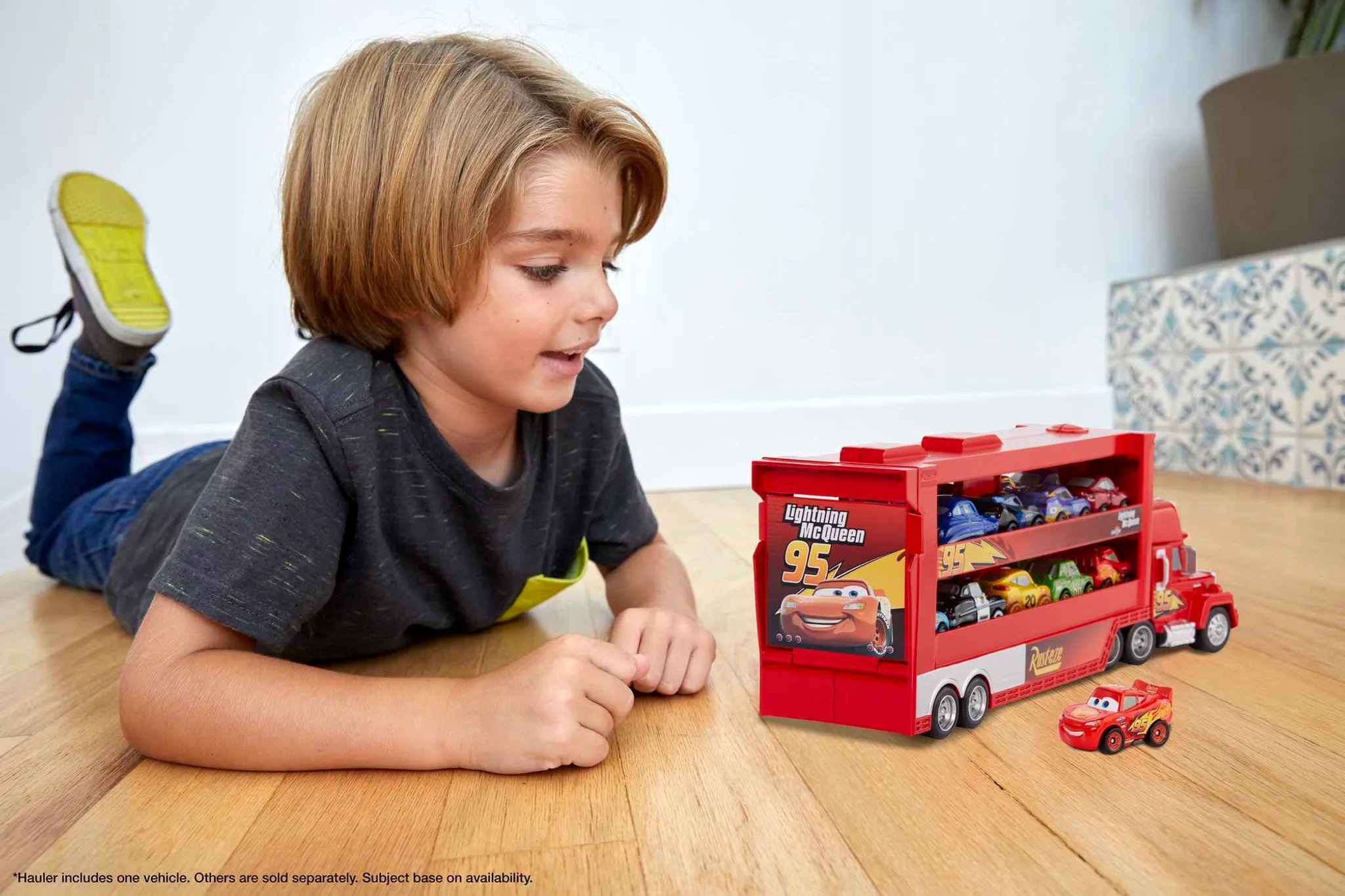 Автовоз, вдохновленный фильмом Тачки от Disney Pixar, — это уникальная игрушка 2-в-1. Он может работать как толкатель и позволяет загружать и разгружать мини-гонщики. Каждый транспортер оборудован складной аппарелью, благодаря которой небольшие автомобили могут беспрепятственно въезжать и выезжать. Транспортер вмещает до 18 мини-гонщиков и включает в себя один автомобиль Mini Racer - Zygzak.