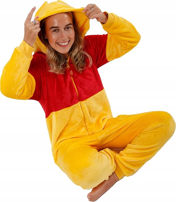 комбинезон для женщин с изображением Винни -Пуха в ярко -желтом цвете с красной мала и практическим капюшоном.