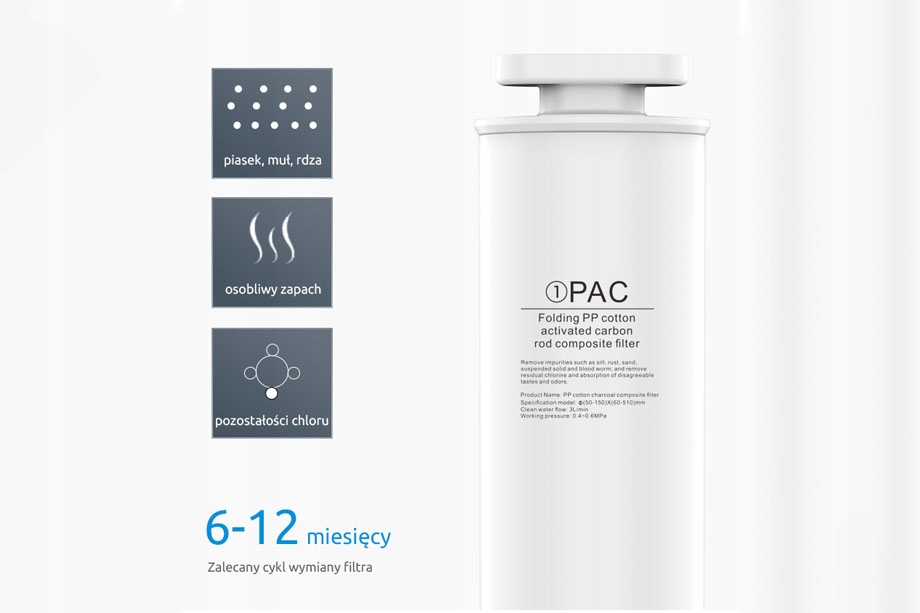 Удаляет из воды крупнейшие вредные частицы и примеси, такие как песок, ржавчина, коллоиды и остатки хлора. Удаляет неприятные запахи и красящие вещества. Рекомендуемая периодичность замены этого фильтра составляет от 6 до 12 месяцев.