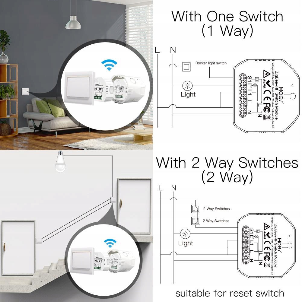 - 1. Протокол ZigBee 3.0 с мини-дизайном подходит для настенной распределительной коробки ЕС/Великобритании и легко скрывается в скрытой настенной распределительной коробке традиционного переключателя, не влияя на оригинальный стиль оформления, что делает его умным, обеспечивая вашим устройствам максимальную интеллектуальную мощность и выключение. переделка и преобразование большинства совместимых продуктов в умные; Традиционный переключатель и этот интеллектуальный модуль могут работать независимо, без помех. (Примечание: этот модуль подходит для кулисного переключателя и сброса.)