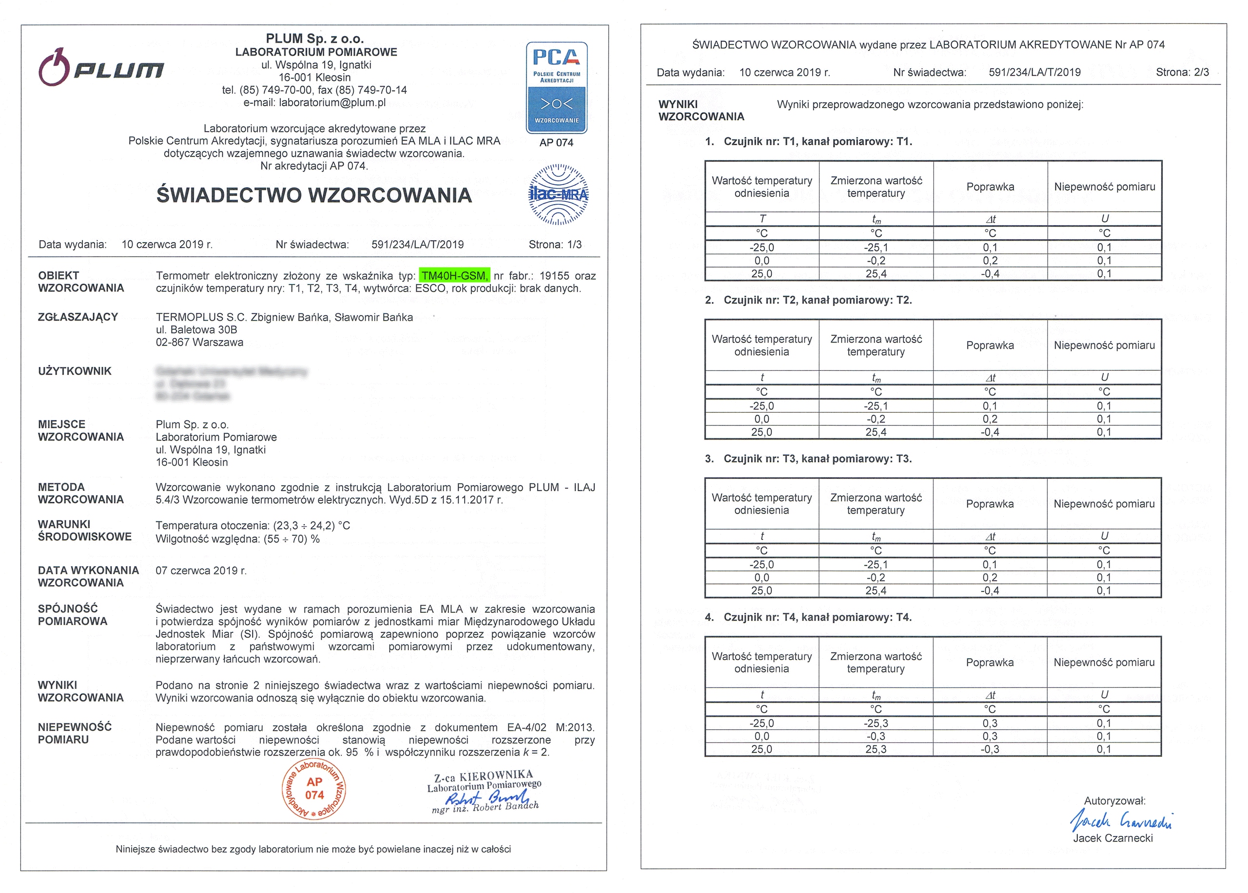 Термометр TM40H-GSM проходит строгую калибровку в аккредитованной калибровочная лаборатория PCA – Польского Аккредитационного Центра. Это гарантирует высокую точность измерений.