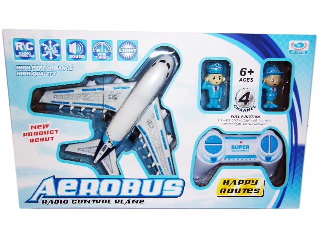 Самолет работает от аккумуляторной батареи, радиоуправляемый, летит прямо вперед и назад и поворачивается в обе стороны. Имеет фонари, крылья с подсветкой, в набор входят две фигурки пилотов размером 7 см.