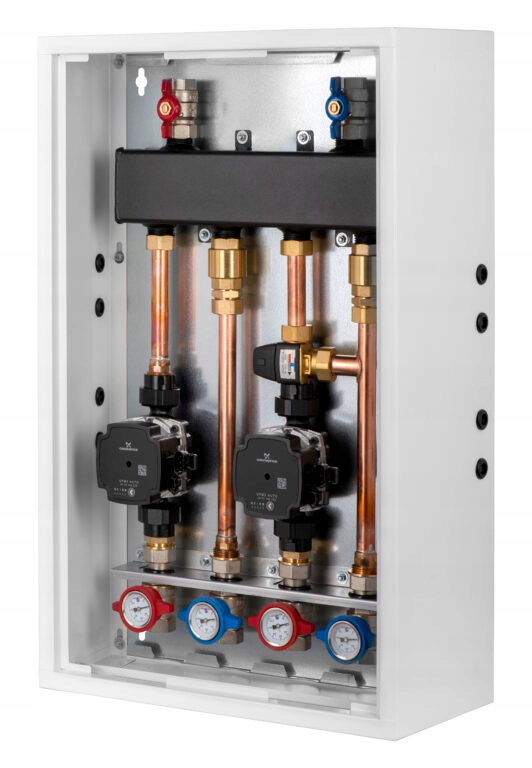 Группы алмазных насосов с насосом Grundfos предназначены для распределения цепей установки на отопление. Они доступны в конфигурации с двумя отдельными цепками отопления (секции) с использованием термостатического клапана.