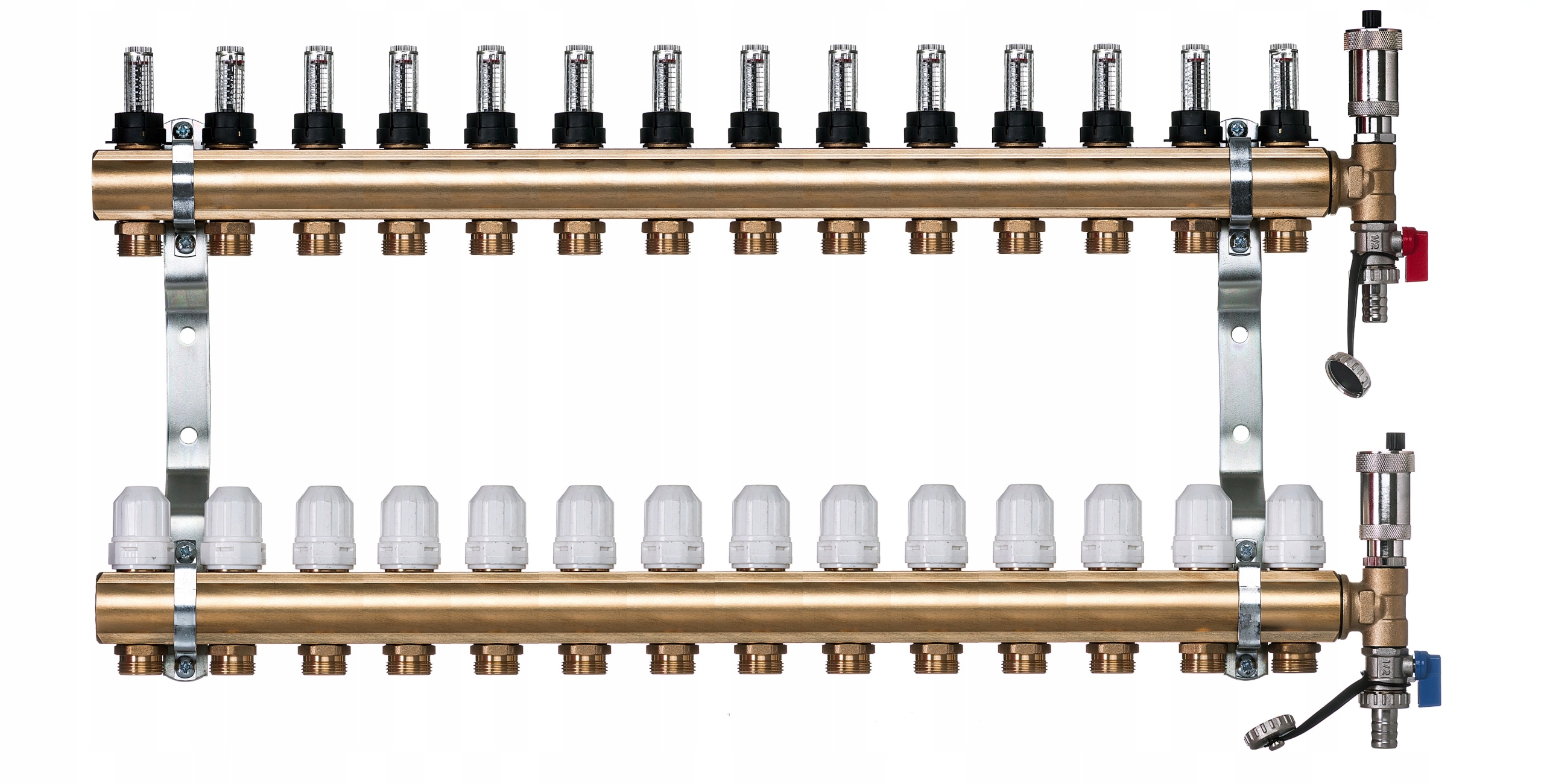 Дистрибьюторы направляют коэффициент нагрева в отдельные петли нагревания под полосой. Наше предложение включает в себя наборы, посвященные как на нагревании нижней части, так и для установок с радиаторами - с балками из латуни или нержавеющей стали. Необходимым оборудованием для нагрева нижнего полоса является расходомеры, которые используются для сбалансировки гидравлической установки, то есть выравнивание потоков на отдельных петлях. Ротаметры высочайшего качества, используемые в коллекторах, позволяют читать поток, а также его правила и полное закрытие данного цикла. Другим элементом коллектора, необходимого для плоского нагрева, являются термостатические клапаны на обратной балке - с ручками для ручной работы и возможностью установки термоэлектрической головки со стандартным соединением M30x1.5 для использования системы управления электронным нагреванием.