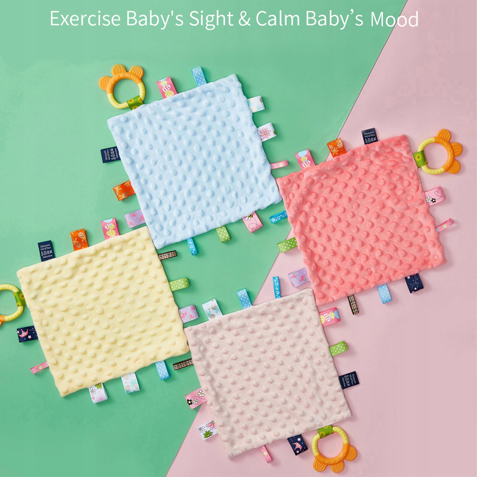 3. Разноцветные бирки: с разноцветными бирками по краям полотенца, которые позволяют тренировать мизинцы ребенка.