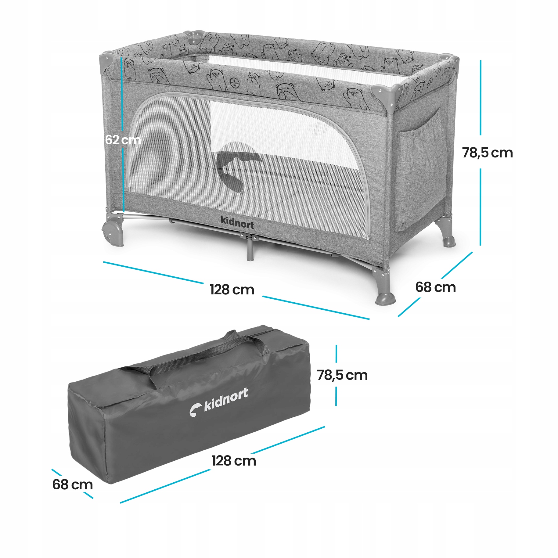 Размеры детской кроватки Ihalig в разложенном виде составляют 128 см x 68 см x 78,5 см.