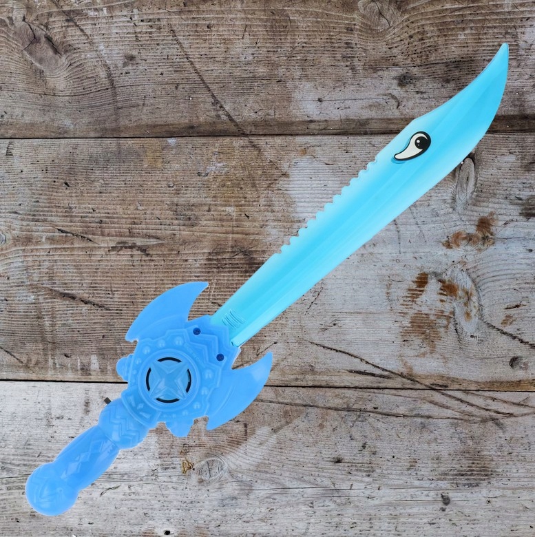 В рукоятке меча имеется переключатель. > при нажатии игрушка начинает светиться разными цветами и издавать звуки.