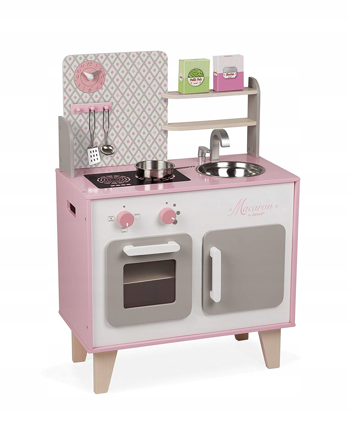Большая деревянная кухня Macaron от французского бренда JANOD доставит массу радости каждому ребенку, позволяя ему безопасно участвовать в повседневных делах или развивать свою страсть к кулинарии. В комплект входит стильная кухня с двумя конфорками, двумя ручками, круглой металлической мойкой, духовкой, нижним шкафчиком, двумя полками и вешалкой на 3 крючка и часами на задней стенке.
