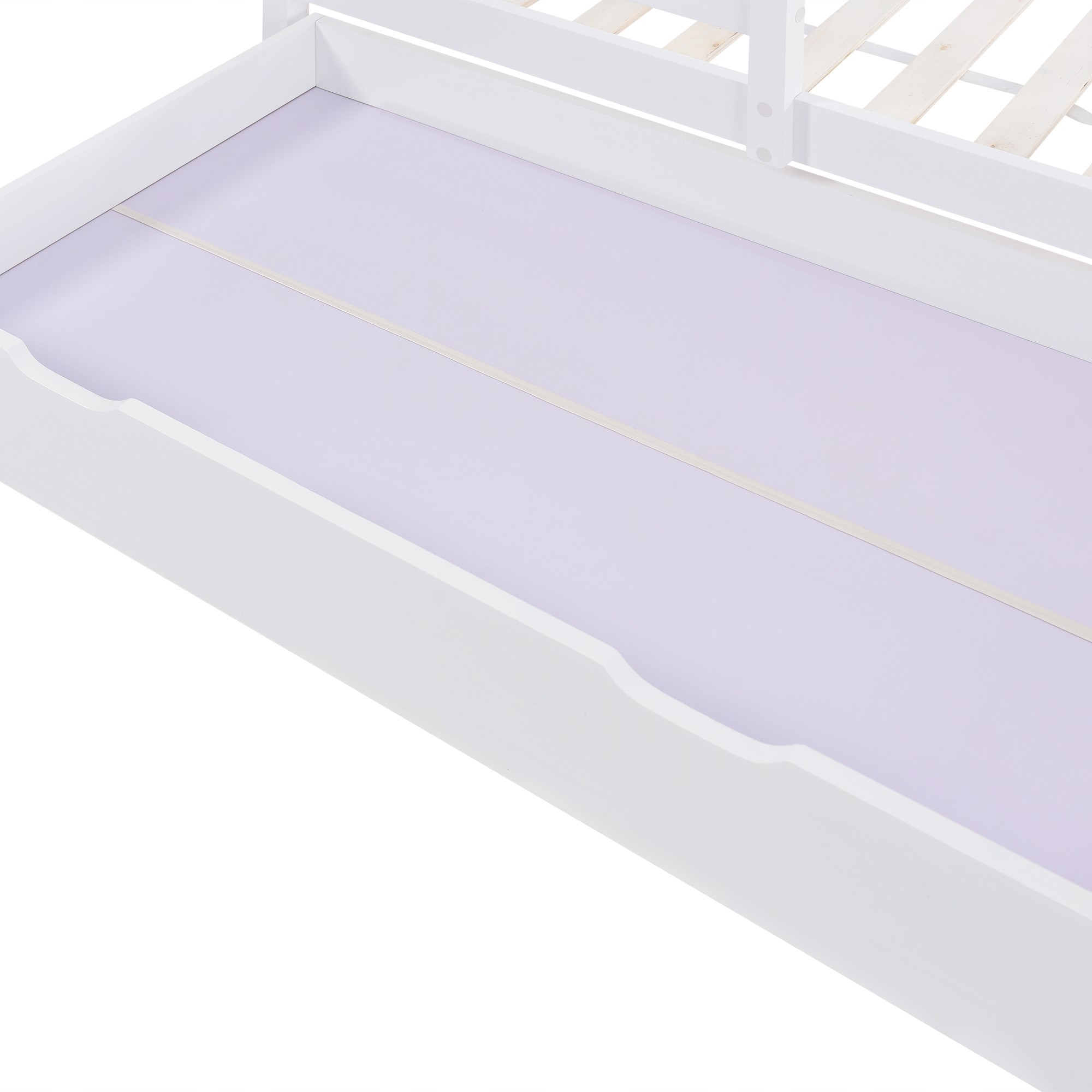 Детский домик-кровать 90 х 200 см, деревянная кровать с бортом и 2 ящиками, массив дерева с ограждением и реечным каркасом, белый (без матраса)