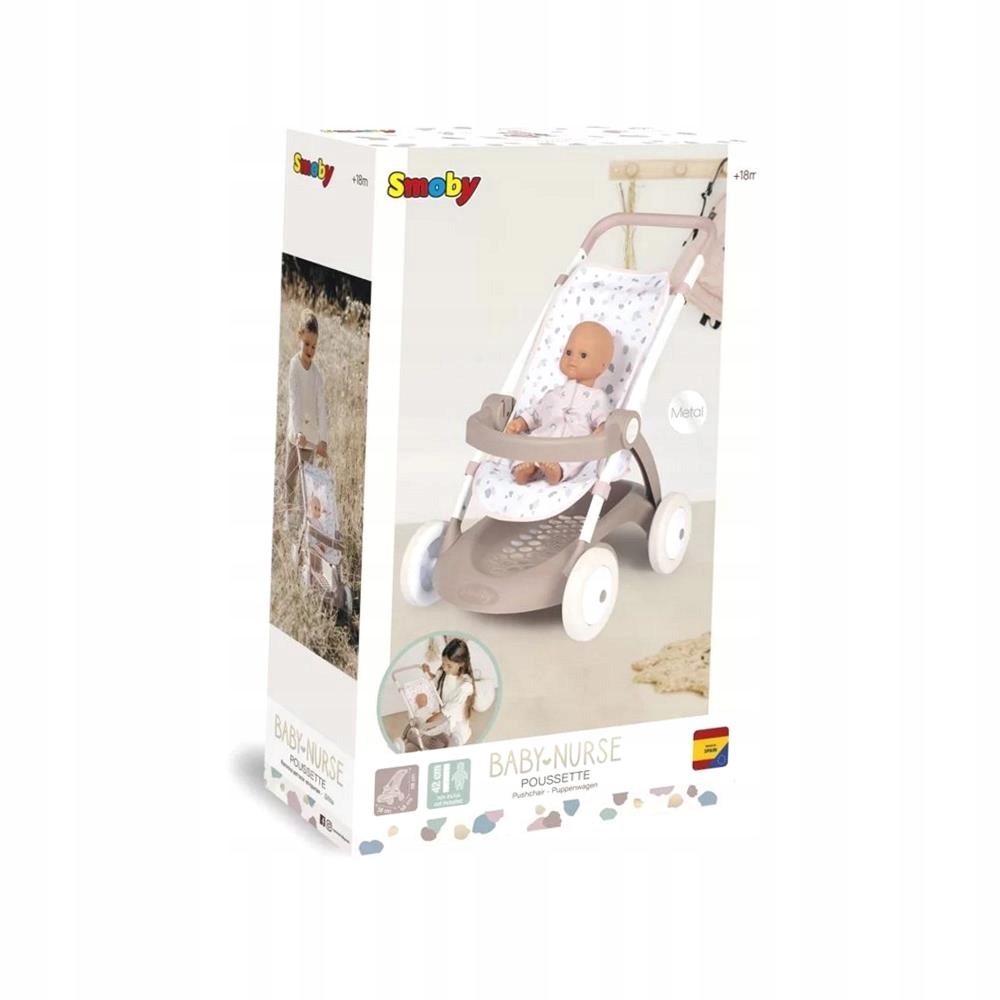 Коляска с пластиковой поручкой, отделанной материалом, задним карманом и корзиной. Изготовлен из металла и пластика. Рука на высоте 58 см, для куклы до 42 см (не включена). Размеры: 58x38x58 см, 18m+