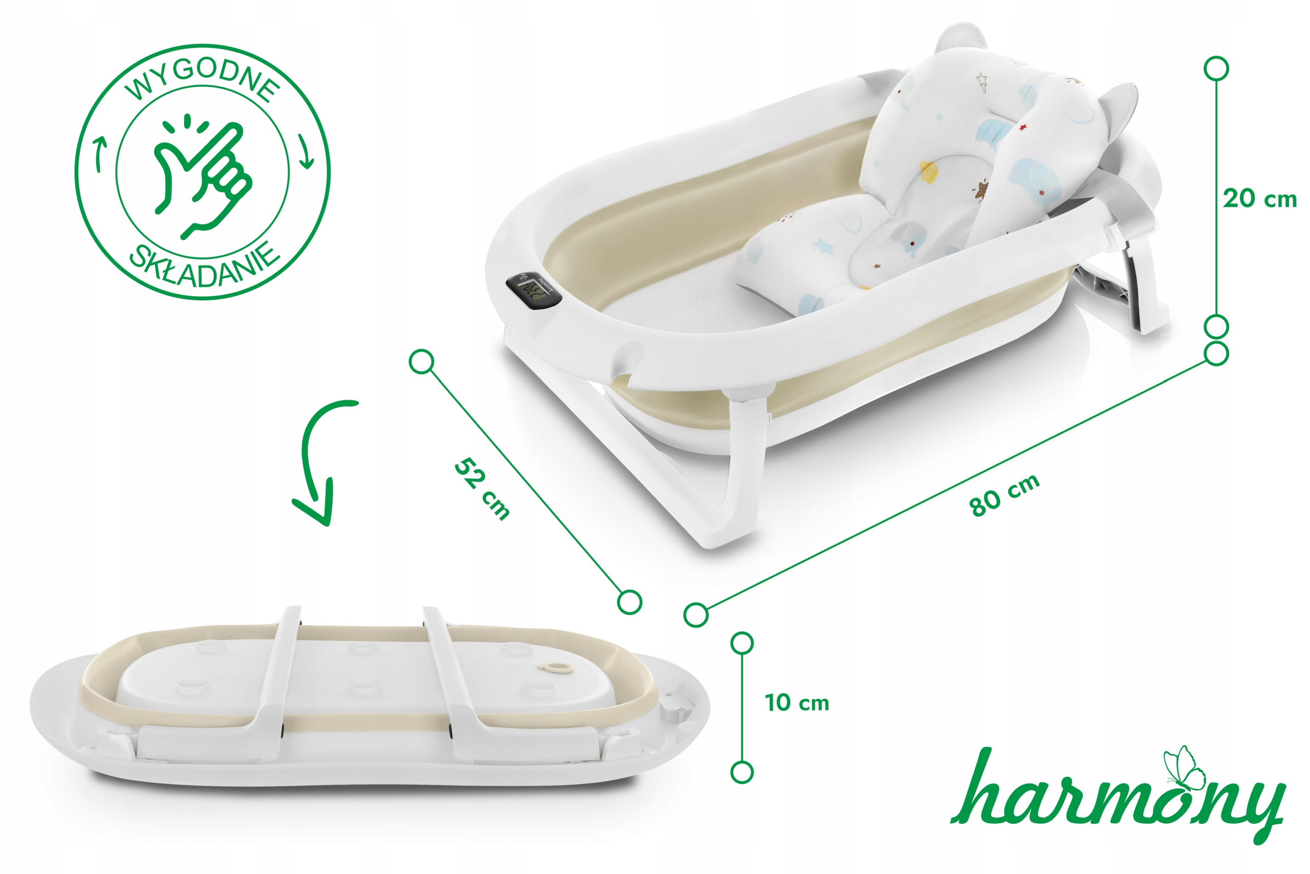 Ванна была разработана для ежедневного комфорта родителей. Благодаря складному дизайну вы можете легко хранить его в гардеробе или взять с собой в путешествие. Встроенный термометр позволяет отслеживать температуру воды, что дает уверен, что ребенок будет купаться в удобных условиях (перед тем, как поставить ребенка в воду, всегда убедитесь, что его температура верна!). Дополнительная подушка, установленная на ремнях, позволяет ванне новорожденных, стабилизируя ее положение.