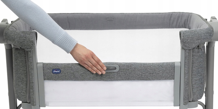 Стенку кровати можно опустить одной кнопкой. Это дает нам больше места, чтобы вытянуть ребенка. Возможно, это ваш способ безопасно уложить малыша спать, не разбудив его. Стенка обычно остается опущенной при использовании Chicco Next 2 Me Evo в качестве дополнительной кровати — тогда ребенок будет в пределах досягаемости, поэтому, когда он начнет просыпаться, мы можем одновременно лежать в нашей кроватке и гладить его. Ваши прикосновения и близость помогут ему успокоиться.