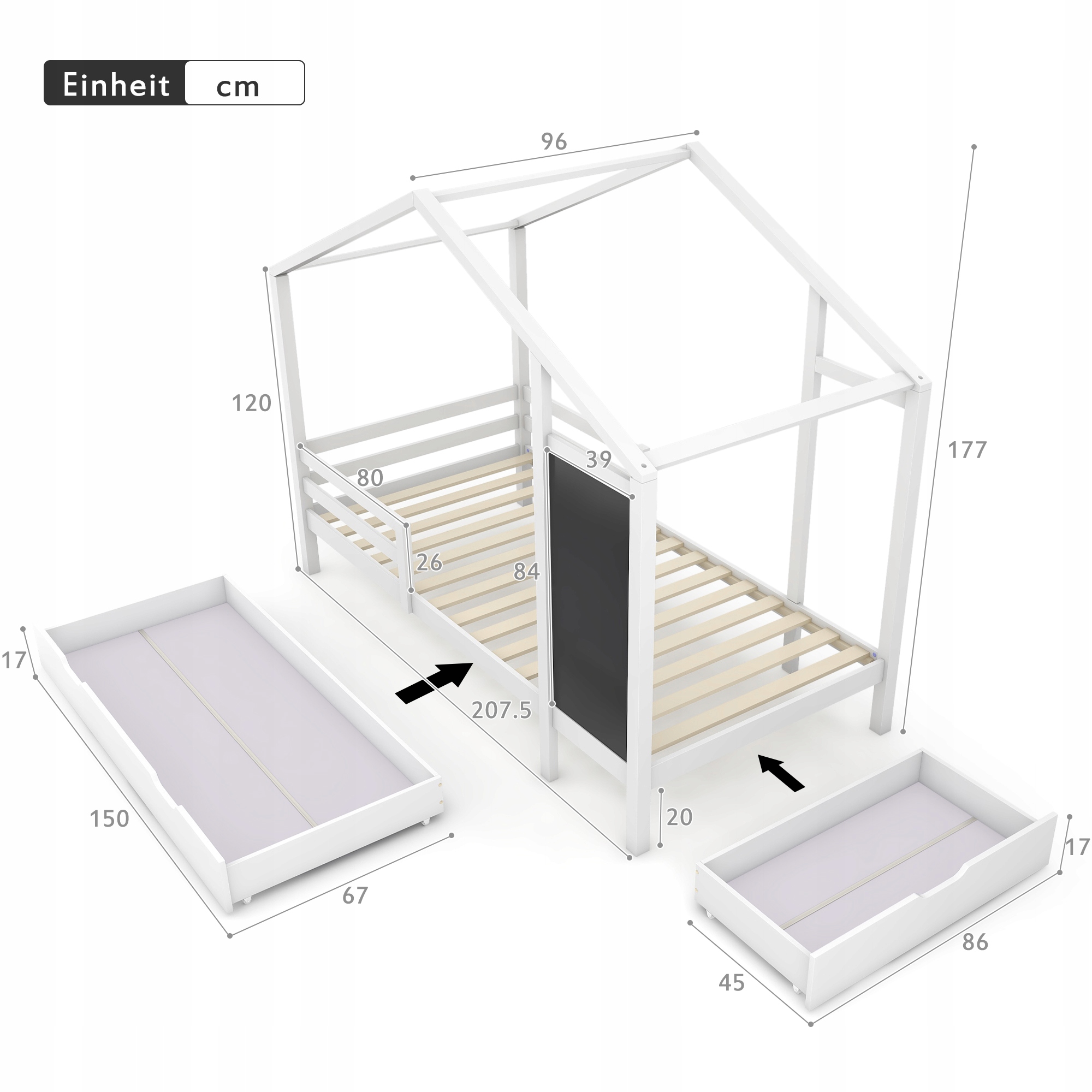 Передняя и боковая часть кровати оборудованы ящиками различной вместимости. Большой передний ящик размером 150x67x17 см вмещает крупные предметы, например, одеяла или спящих кукол. Боковой ящик размером 86 x 45 x 17 см вмещает несколько карандашей для рисования.