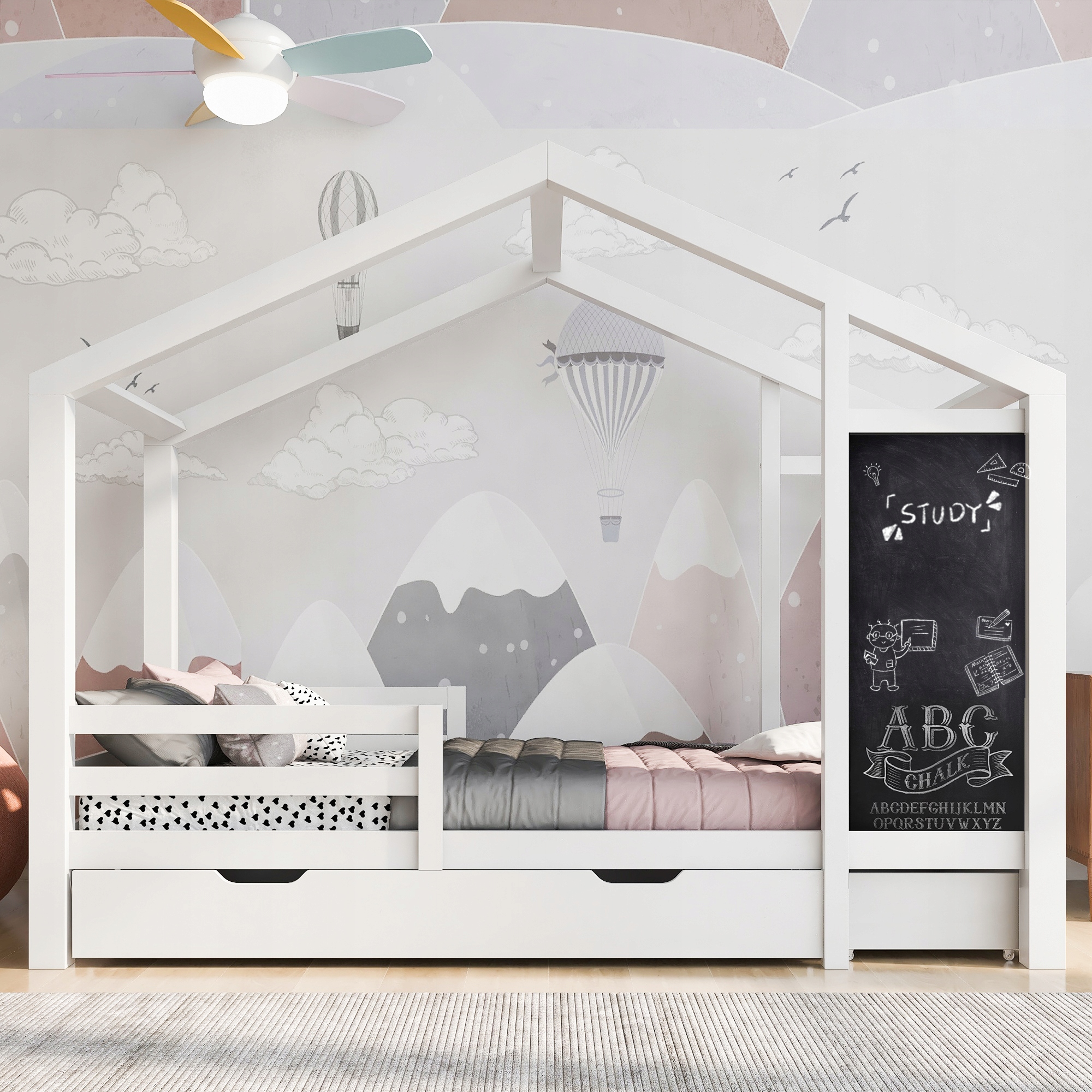 Кровать имеет общую форму крыши, которая увеличивает пространство для передвижения. Передняя часть оснащена панелью размером 84*39 см, что делает ее экономичной кроватью, совмещающей в себе развлекательную и спальную функции. Уникальный дизайн позволит придать спальне вашего ребенка творческий подход.