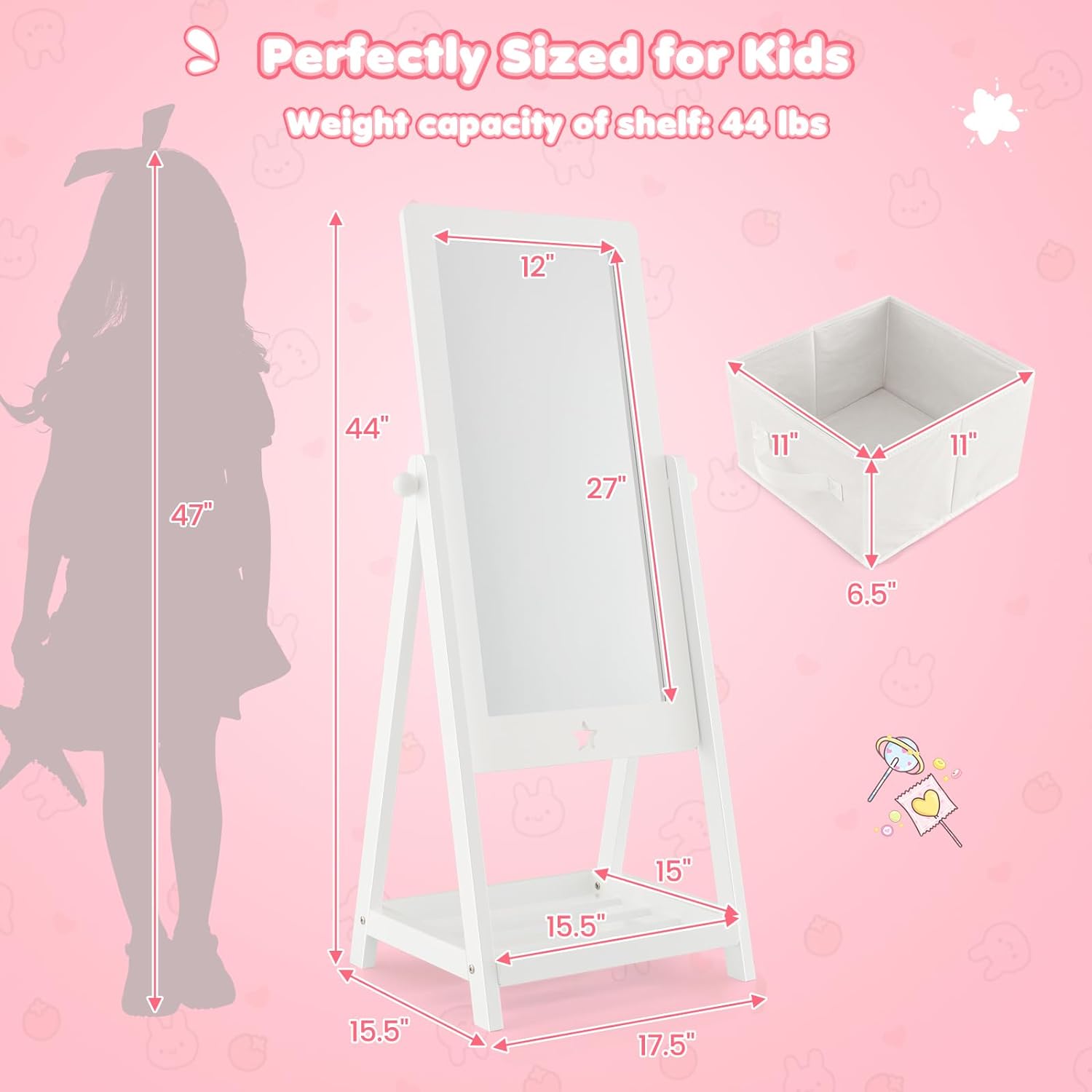 Большое место для хранения: Отдельно стоящее зеркало оснащено 2 боковыми крючками, съемной складной корзиной и нижней полкой, что обеспечивает удобное и просторное место для хранения детских игрушек, обуви, сумок, головных уборов. и многое другое
