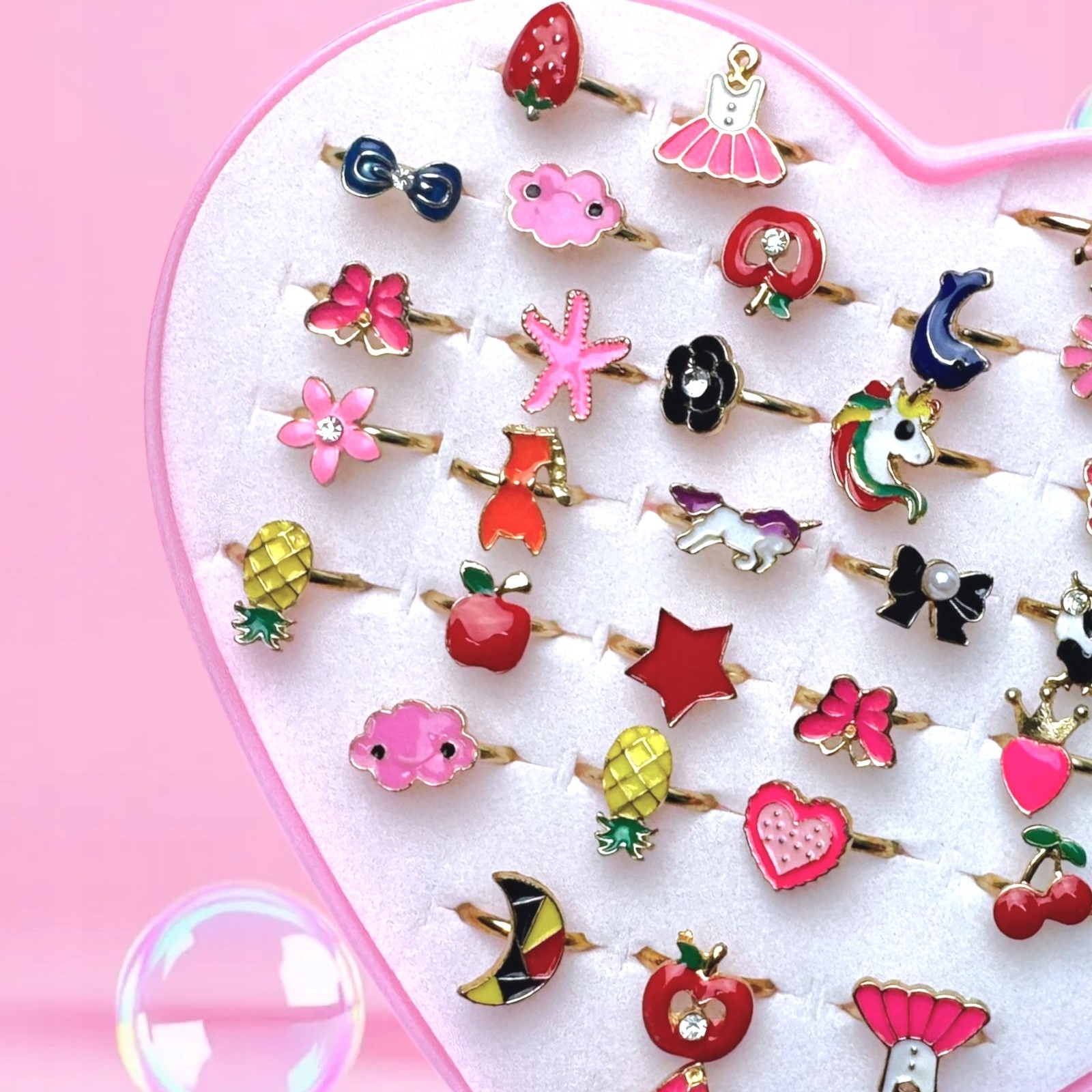 На съемочной площадке вы найдете множество узоров, вдохновленных миром детского воображения - бабочек, цветов, радуги, единорогов, фруктов, звезд и многих других. Каждое кольцо было сделано с вниманием к деталям и украшено разноцветной эмалью.