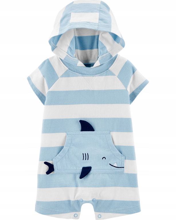 — это одежда из 100% мягкого хлопка, воздушная и приятная на ощупь. Не раздражает кожу ребенка. Rampers имеет прочные кнопки в промежности, которые облегчают смену подгузника. Полосатый костюм с удобным капюшоном оснащен карманом в форме акулы с выступающими частями. Комбинезон не стесняет движений ребенка, хорошо сидит по фигуре, а благодаря веселому зверюшке малыш будет охотнее его надевать.