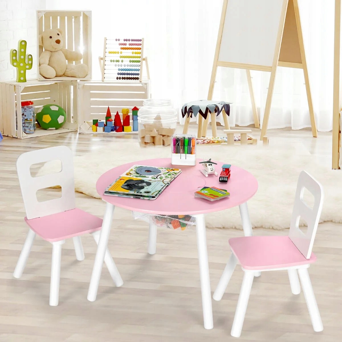 Наш комплект из стола и стульев позволяет создать комфортное пространство для детей в любой комнате. Он станет отличным местом для чтения, письма, обучения, еды и игр. Входящий в комплект сетчатый мешок под столешницей позволяет удобно хранить игрушки. Все углы закруглены, чтобы защитить детей от случайных травм. Все детали изготовлены из деревянного каркаса, что обеспечивает максимальную долговечность и прочность на долгие годы использования. Благодаря эстетичному и очаровательному дизайну он идеально подойдет для гостиной, детской комнаты, детского сада или базы отдыха.