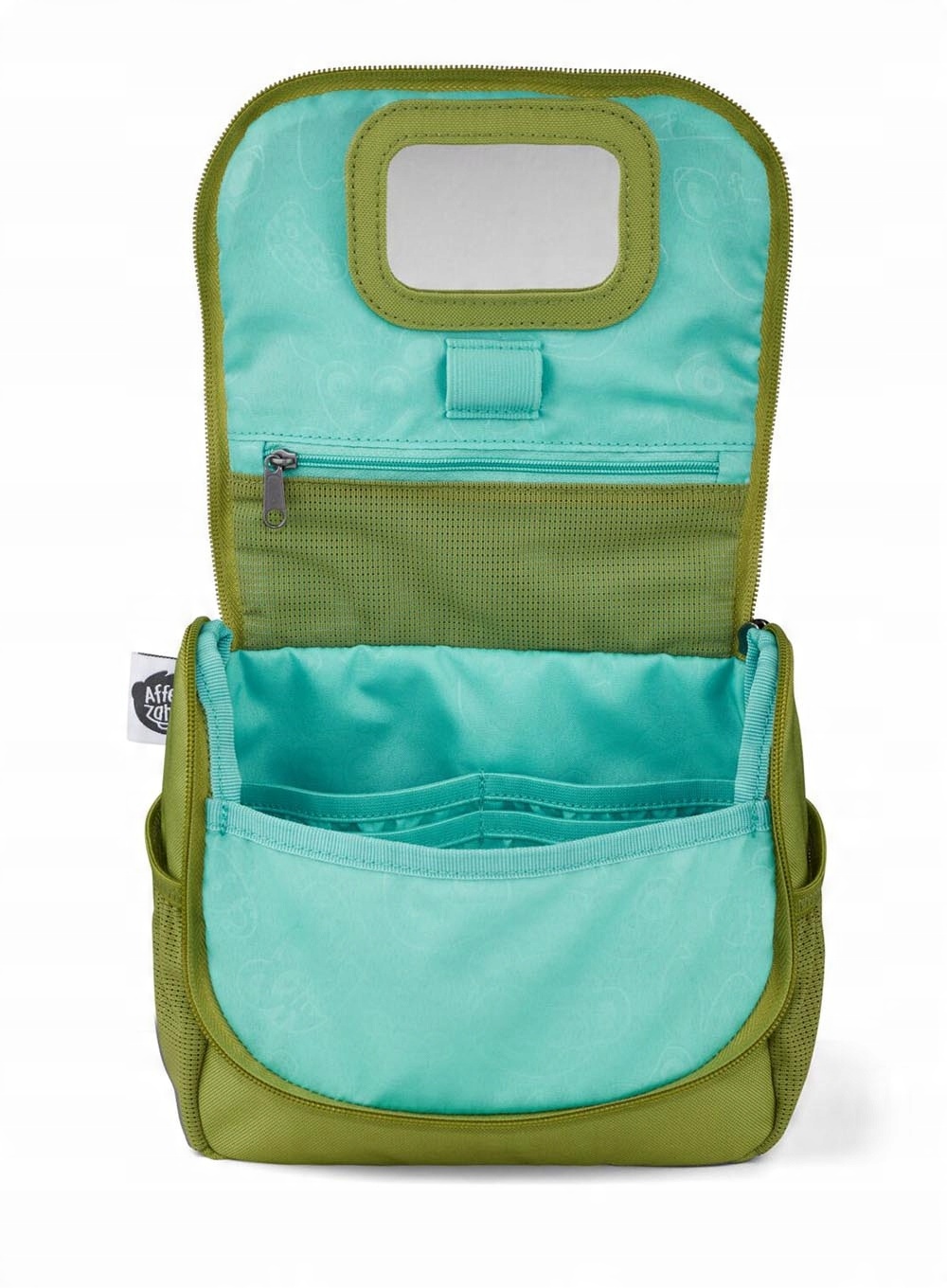 Уникальным элементом косметолога является расширяемый язык с местом имени ребенка и съемным зеркалом, прикрепленным к липучке, что делает чистку зубов или еще проще. Благодаря гидрофобному и устойчивому к грязи материал, изготовленный в 48% обработанных бутылок для домашних животных, косметика Affenzahn является экологическим и длительным отбором.