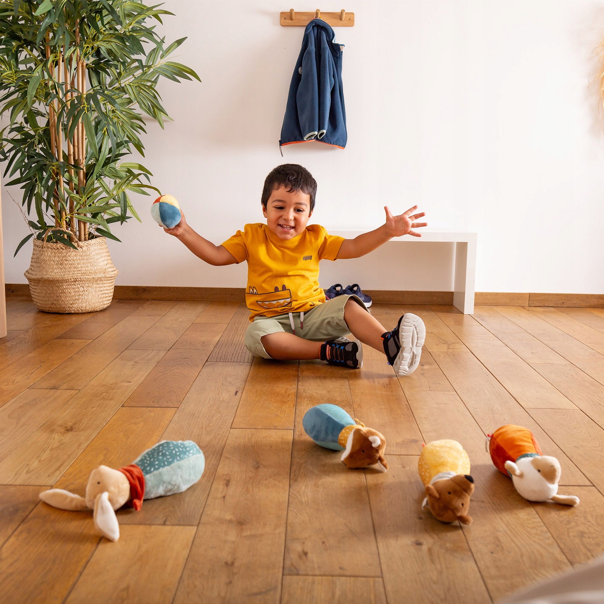 Откройте для себя уникальный мягкий набор для боулинга для детей от известного немецкого бренда sigikid, который поднимает удовольствие на совершенно новый уровень. Этот уникальный продукт содержит 4 кегли для боулинга с головами дружелюбных животных, таких как лиса, овечка, плюшевый мишка и кролик, а также красочный метательный мяч. Благодаря этому набору дети смогут дружно играть и развиваться.