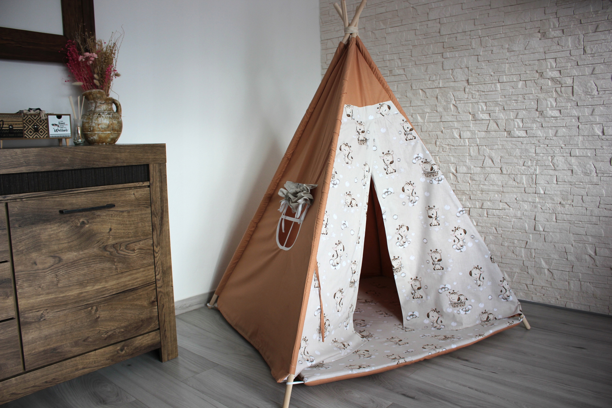 - ПАЛАТКА ТИПИ - изготовлена из 100% ХЛОПКА ВЫСОЧАЙШЕГО КАЧЕСТВА с детскими узорами. Имеет окно с занавеской, которую можно завязать.