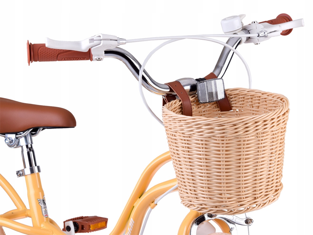 - Руль профессионального профиля — с безопасными резиновыми ручками приглушенного коричневого цвета. Его дополняет классическая корзина из пластика, имитирующего плетение.