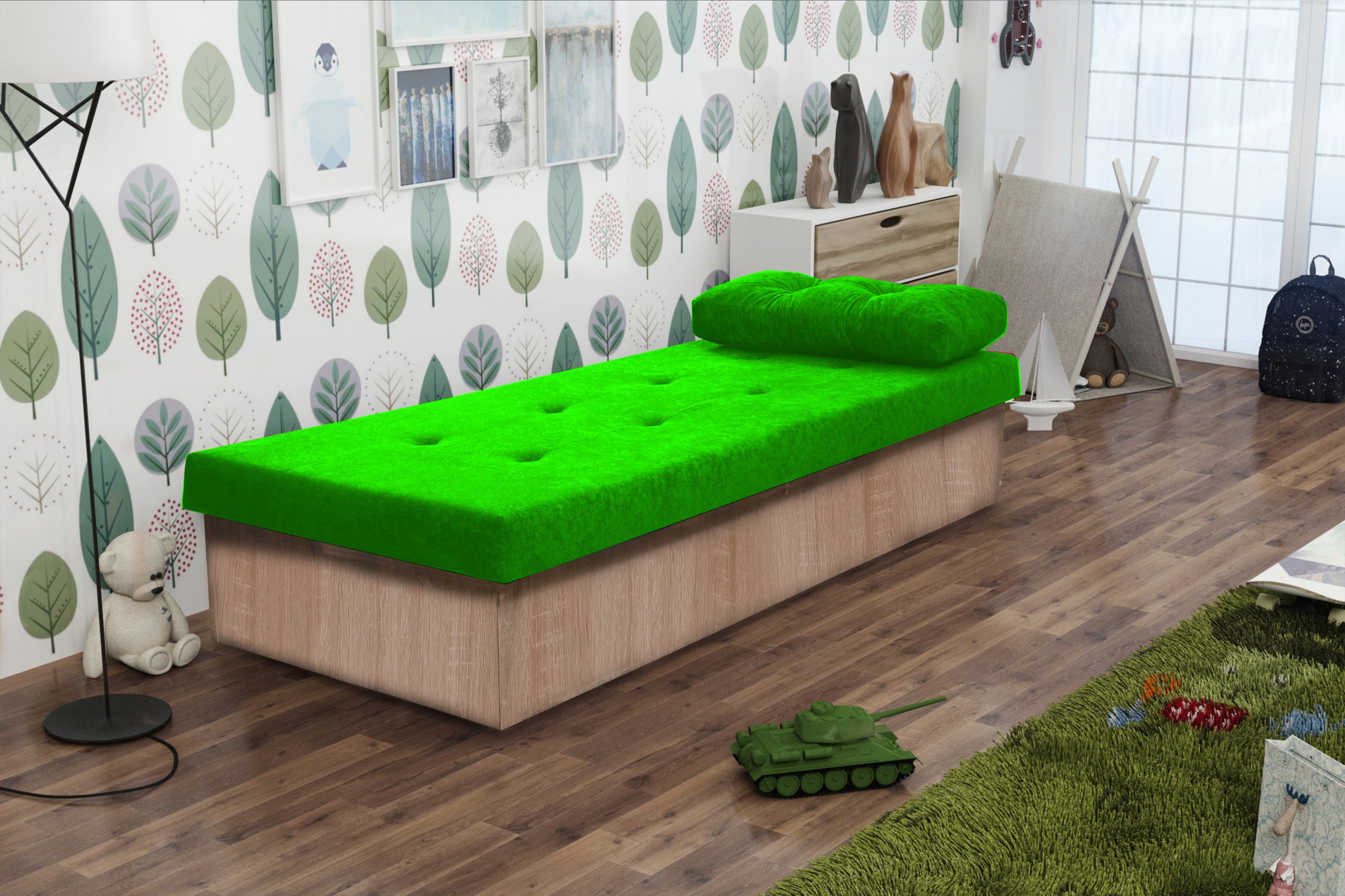 Диван на фото ниже выполнен из зеленой ткани + основа дуба Сонома