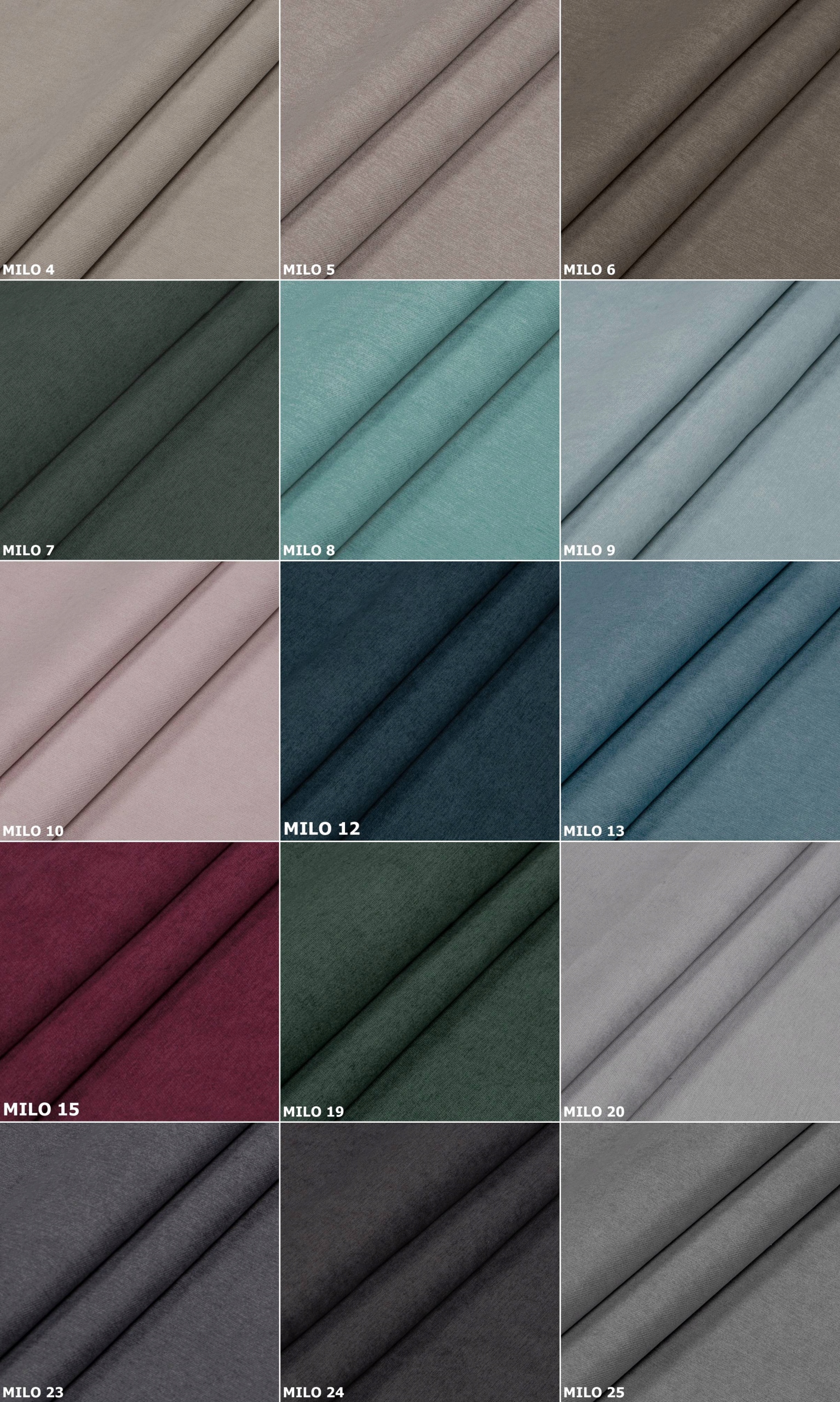 <ул>Ткань Milo – мягкая и приятная на ощупь мебельная ткань, произведенная по технологии Easy Clean. Дышащая ткань насыщенных цветов, устойчивая к истиранию.