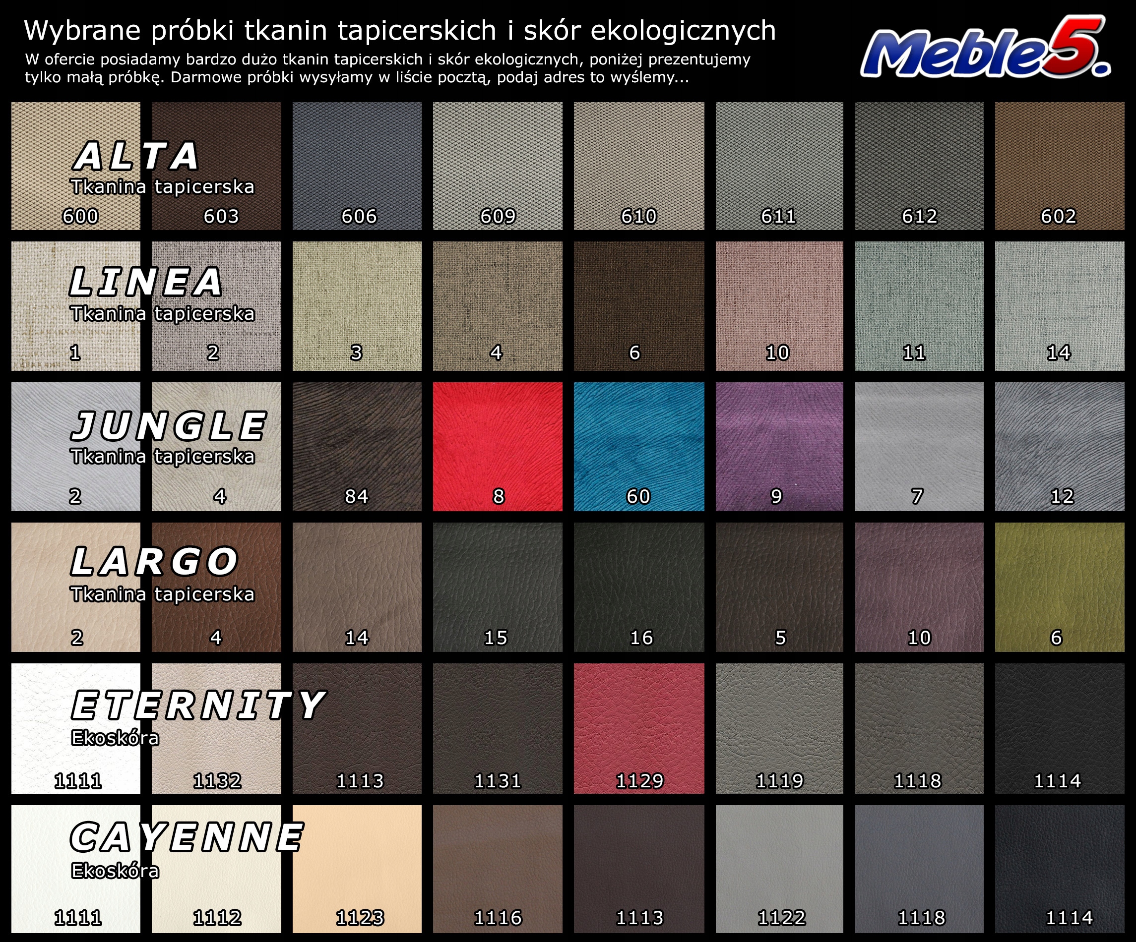 для клиентов, которые, из -за времени или расстояния, не могут посетить нас лично, мы предлагаем возможность отправить выбранные образцы материала в конверт (ткань, искусственная кожа, натуральная кожа). Достаточно предоставить нам адрес электронной почты или SMS -адрес, на который мы отправим образцы через Poczta Polska