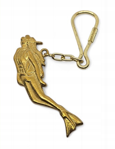 Брелок в форме дайвера из латуни с короткой цепочкой, заканчивающейся небольшим карабином, благодаря которому его можно легко прикрепить к ключам, кошельку или рюкзаку.