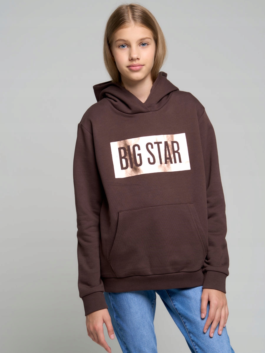 Для активных девушек, которые любят проводить много времени на свежем воздухе, это худи станет идеальным выбором. Он изготовлен из натурального хлопка с флисовой отделкой, приятен на ощупь и очень теплый. Свитшот для девочки подойдет в качестве верхней одежды в прохладные осенние дни. Имеет классический крой, поэтому не стесняет движений. Толстовка от BIG STAR выполнена в теплом коричневом цвете. Ее главным украшением является большой принт из розового золота спереди, который придает ей девичий характер. Толстовка прекрасно сочетается со спортивными штанами ABUELITA 804 той же линии.