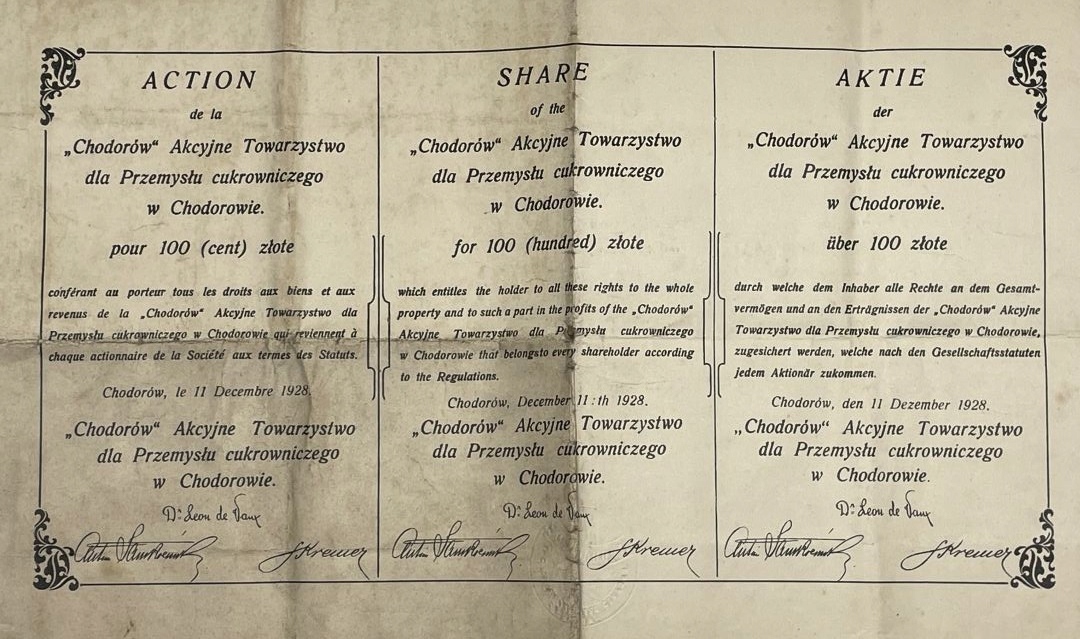 Действие № 73988 Общества «Chodor» для сахарной промышленности в Chodorów для PLN 100 - Kresy - Chodorów - 11 декабря 1928 г. Chodorów, на который каждый акционер имеет право на основе закона общества