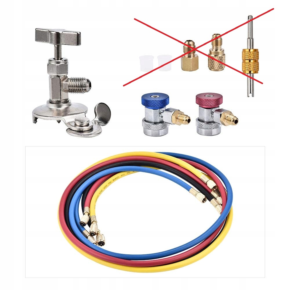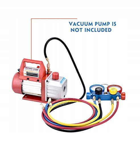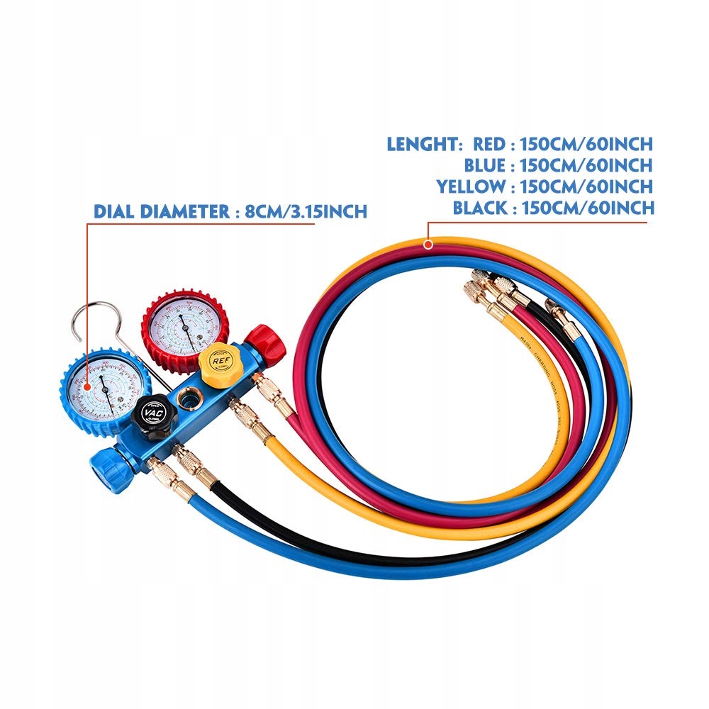 Шланг 4 цветов --- в комплект входят 4 гибких заправочных шланга для фреона длиной 5 футов, 4 цвета легко идентифицируются: красный означает высокое давление, синий означает низкое давление, желтый означает баллон с хладагентом, черный означает вакуумный насос.