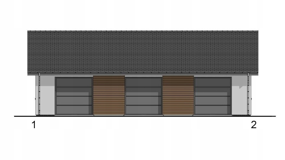 Гараж в современной цветовой гамме, черепица антрацитового цвета, основная часть здания белого цвета с темно-серыми окнами и дверями. четко выделяясь на его фоне, а деревянная обшивка при входе в хозяйственную часть непременно впишется в любой тип ландшафта и застройки.