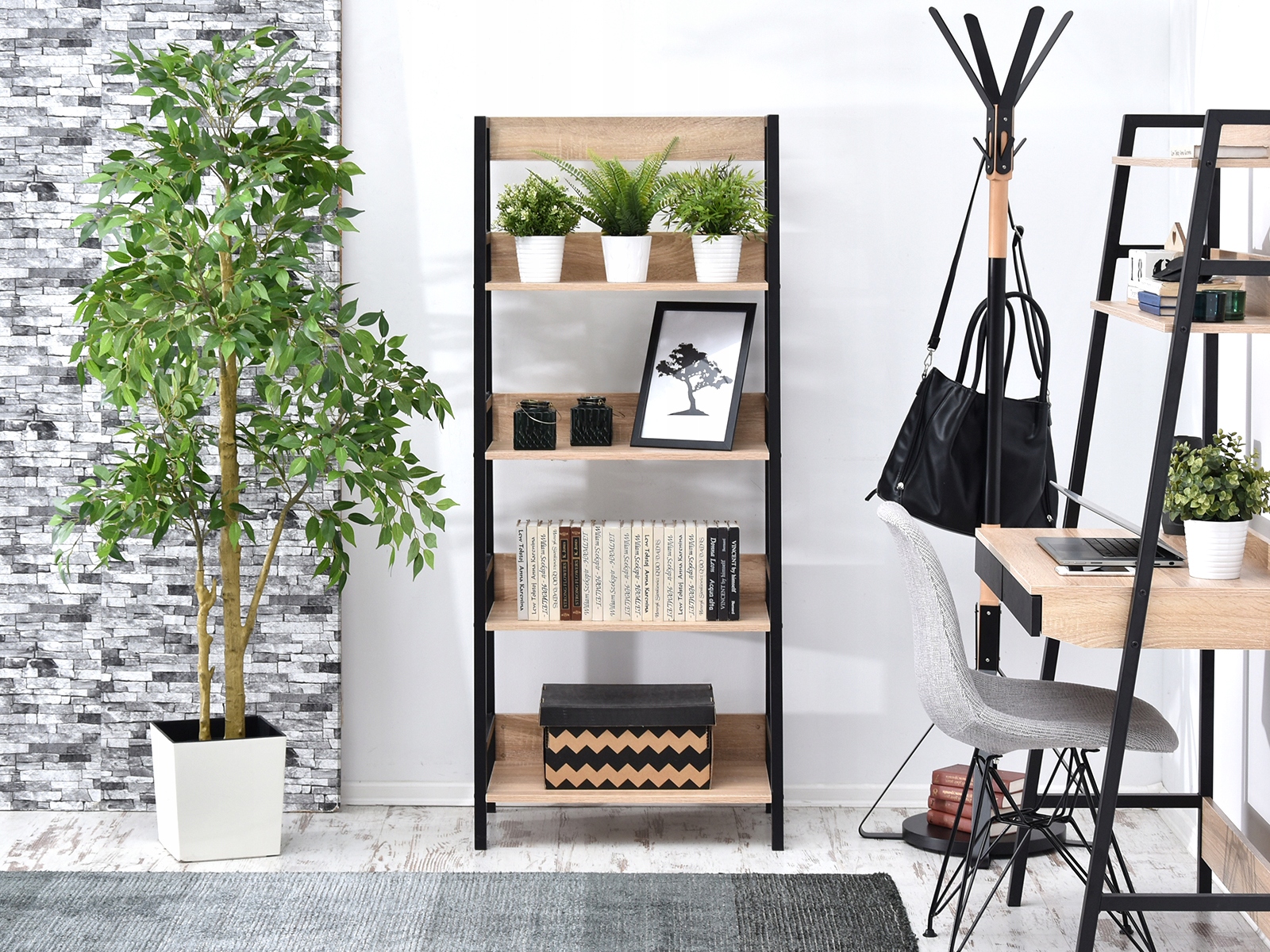 Современная полка в форме лестницы. Эргономичные полки и дизайнерская форма позволяют мебели идеально вписаться как в стилизованные студии, так и в уютные молодежные комнаты. Интересное цветовое сочетание металлического каркаса с черным порошковым покрытием и полок из дуба Сонома прекрасно подчеркнет любой интерьер.